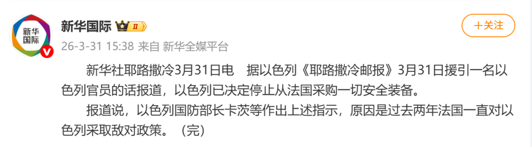 据以色列《耶路撒冷邮报》3月31日援引一名以色列官员的话报道,以色列已决定停止从法国采购一切安全装备。