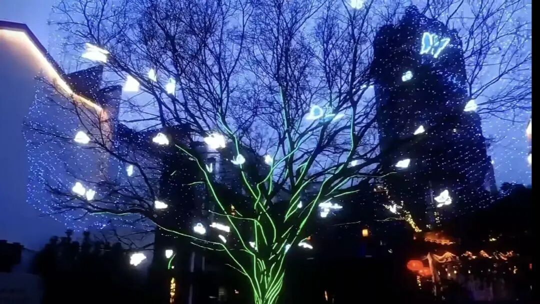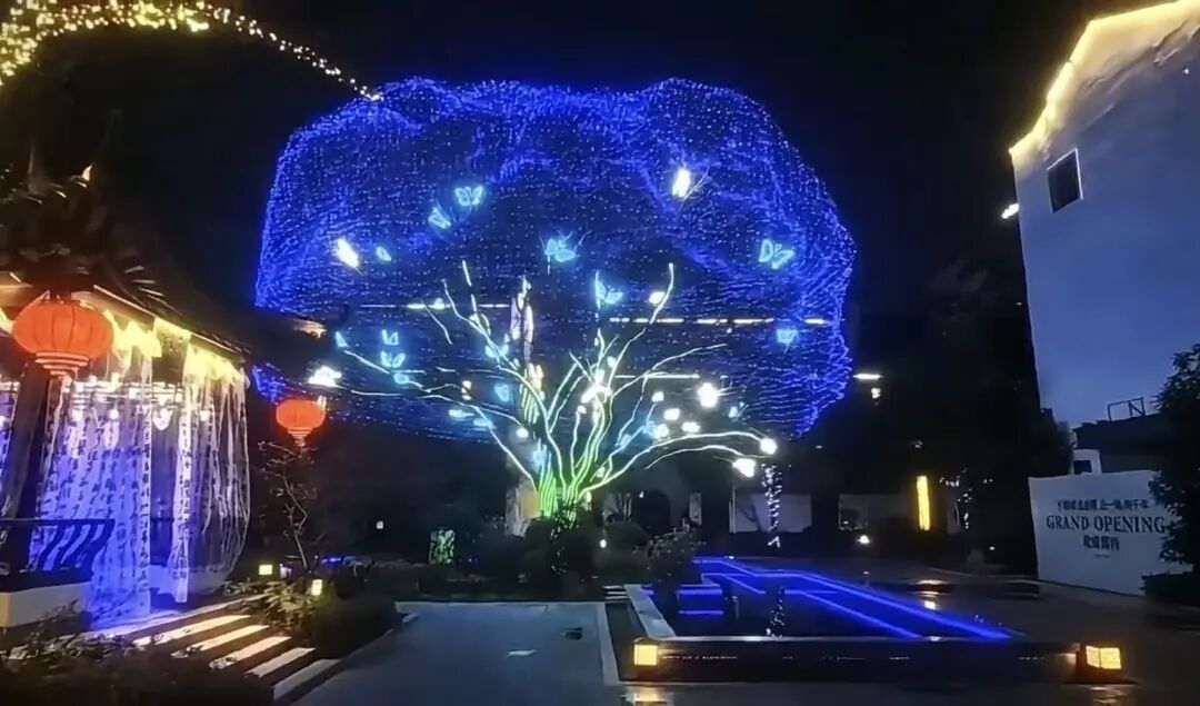 树枝间点缀的发光蝴蝶造型灯轻盈闪烁,与星点灯光相互呼应,构成“蝶舞星河”的梦幻场景。
