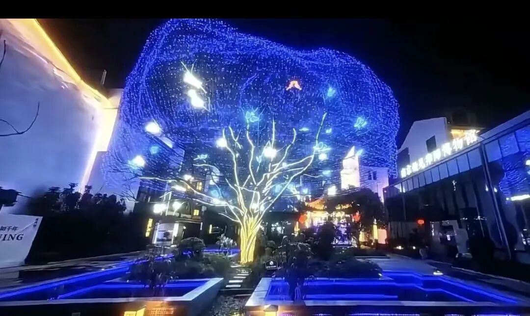 夜幕降临,暖金色灯线勾勒出树干与枝桠的遒劲轮廓,上方覆盖的蓝色星点灯网如星河倾泻,与街巷青砖黛瓦相映成趣;