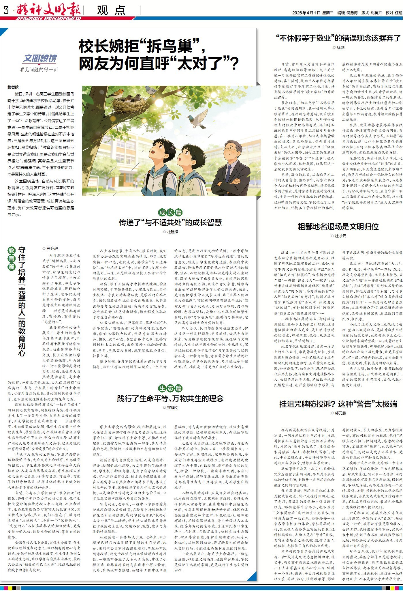 深圳这位校长没有盲从“一切为了考生”的功利化教育思维,婉拒拆除鸟巢,并借机为学生上了一堂关于生命、自然与成长的教育课,正是学校教育应有的坚守——让生命教育、生态教育回归校园,让学生在成长中学会敬畏生命、尊重自然。每个教师都有责任让学生在紧张的学习之余,明白分数之外,还有更广阔的天地与更深厚的人文关怀,这正是现代教育所倡导的“全面发展”的应有之义。