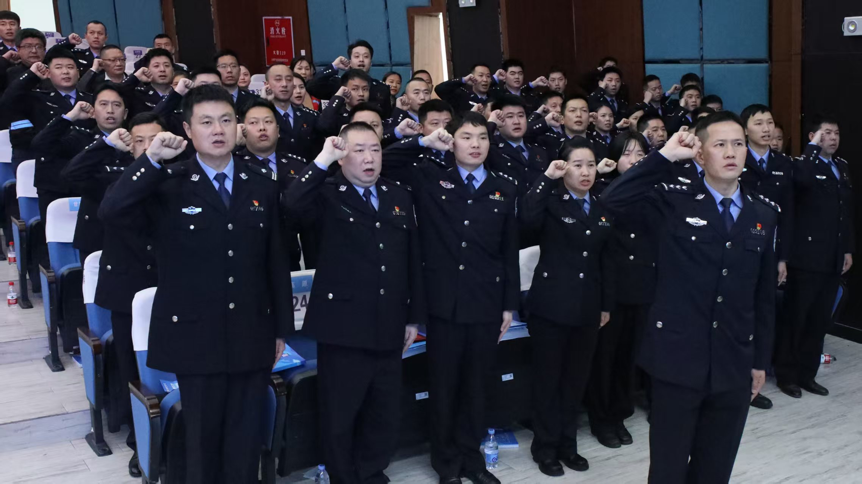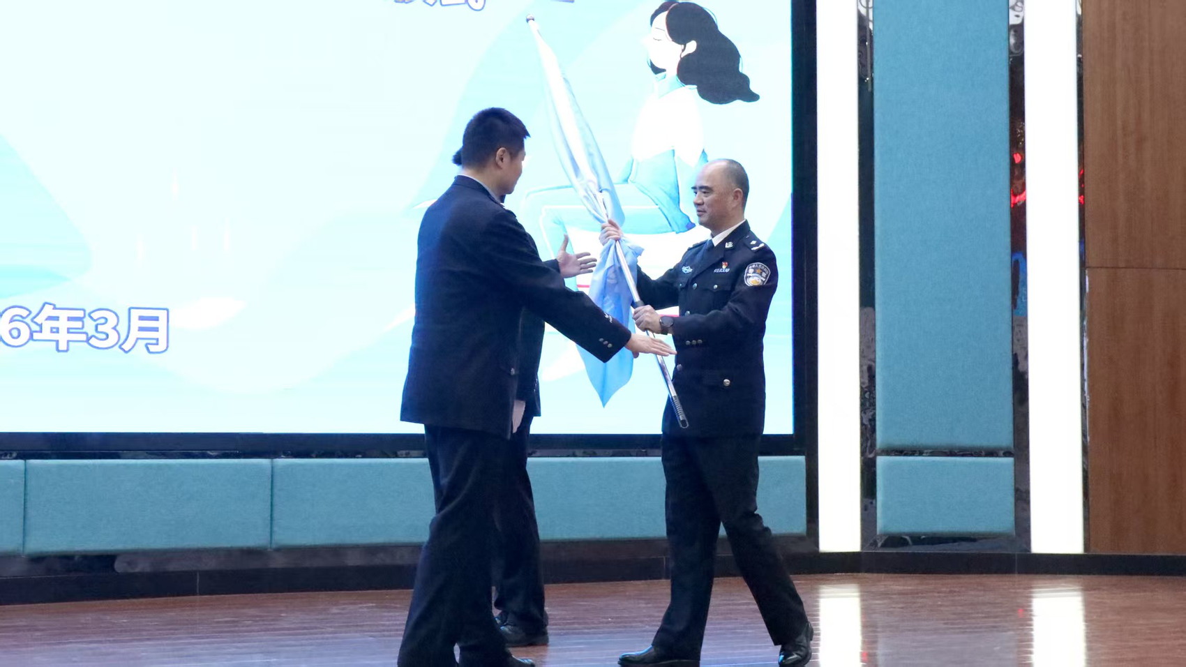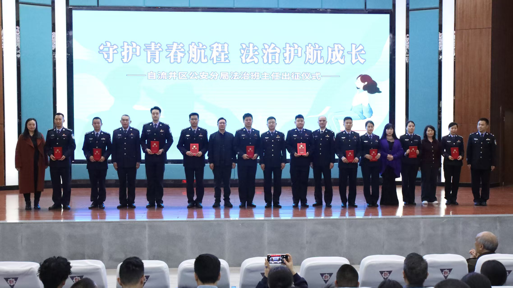 仪式上宣读了《关于聘任高原等96名同志为法治班主任的决定》,为96名法治班主任逐一颁发了聘书,并为法治班主任授旗,正式明确民警校园法治教育、安全管理等核心职责,标志着自流井区“法治班主任”制度落地实施。
