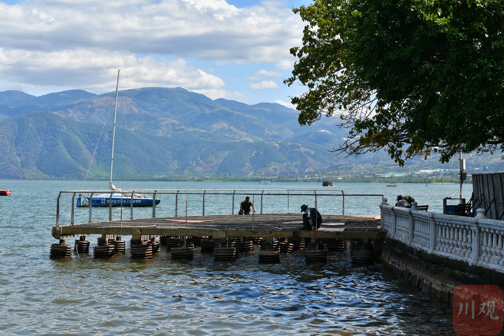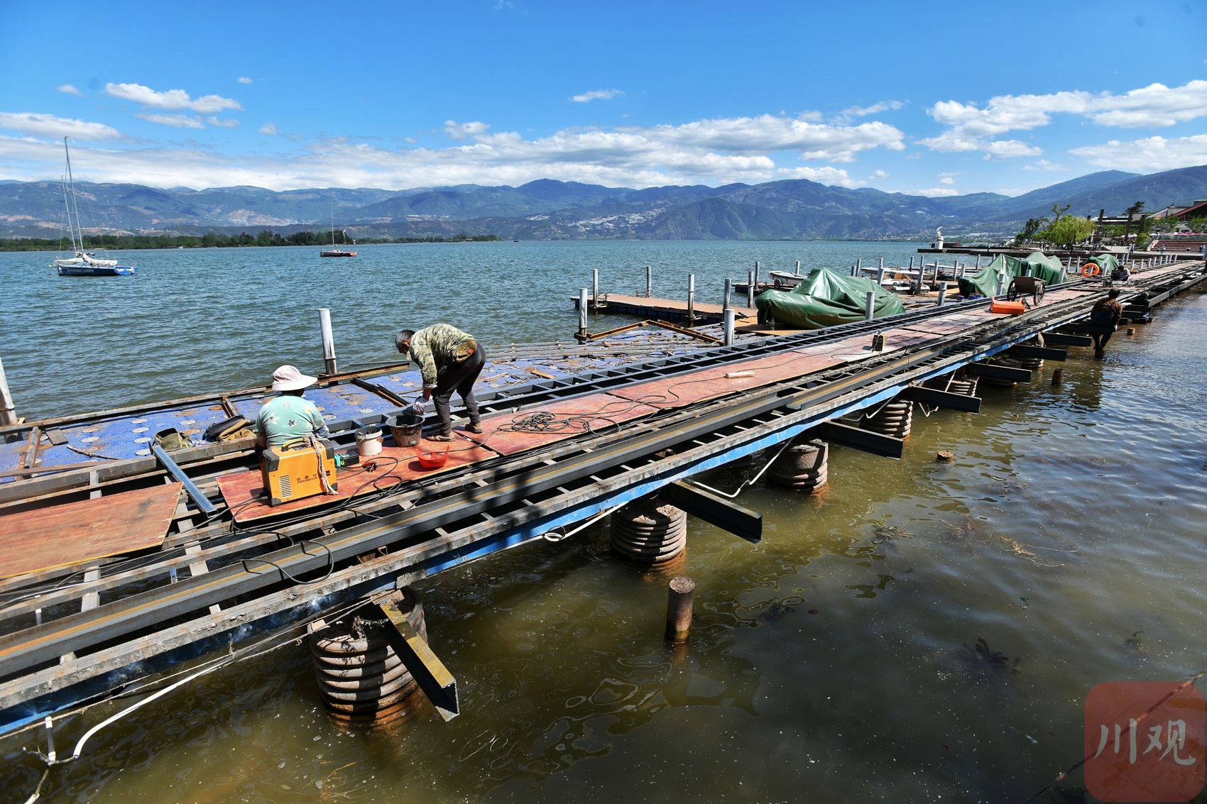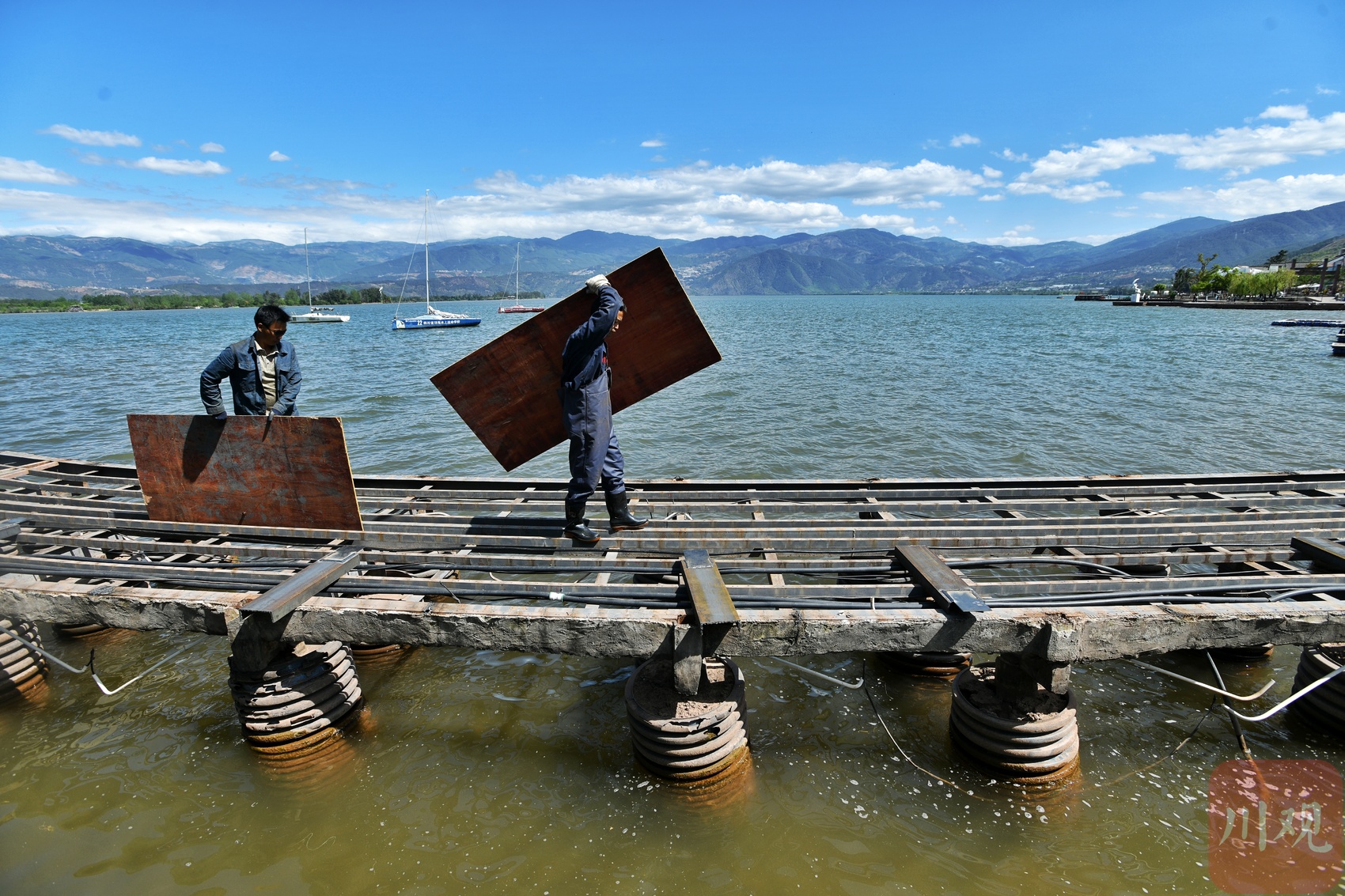 邛海边的栈桥施工现场。