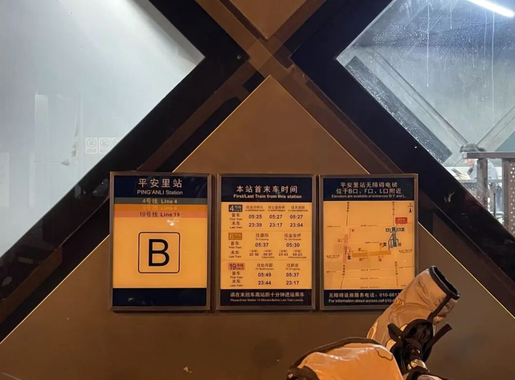 地铁牡丹园站10号线换乘19号线时,藏在柱子斜后方的无障碍电梯指引。