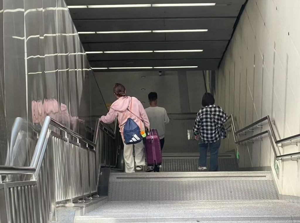 她先是来到马路东侧一个地铁口,发现同样只有上行扶梯;折返后询问路人,被指向北边较远的地铁口,跑过去查看,仍然只有上行扶梯。几经辗转,她才在马路东侧另一地铁口南侧找到一部直梯。
