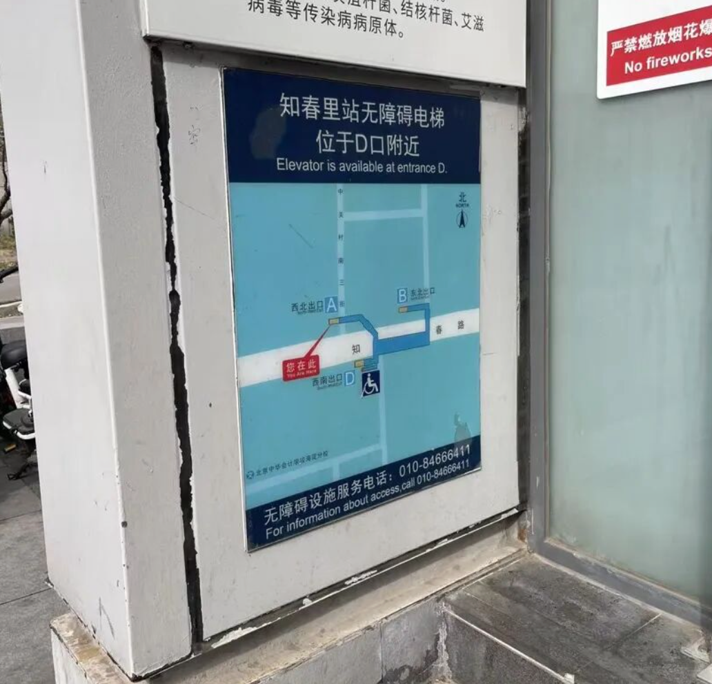 各站口张贴的无障碍电梯提示位置并不统一,有的在门左侧,有的在门右侧,还有的在站口侧面。导航软件通常就近定位地铁口,常有老人、行李旅客或推婴儿车的家长行至地铁口才发现:没有扶梯,只能步行下楼。