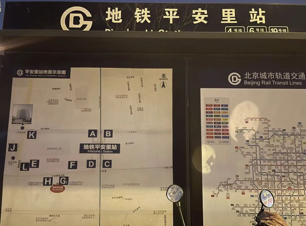 记者在多处出入口外均见到了黄女士所说的信息栏,上面标注了11个出入口的位置,却未标明进站扶梯或直梯信息。不过记者留意到,平安里站每个出入口附近均有蓝色的无障碍电梯提示,显示电梯位于B、F、L口附近,并留有服务电话。站口内,侧墙处也有更详细的示意图,标注有直梯信息,但这些位置往往不如站外信息栏醒目,很多乘客并未留意到。至于每个出入口的扶梯情况,记者在站内外未见到任何提示信息。