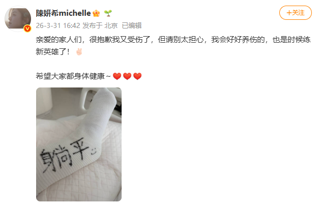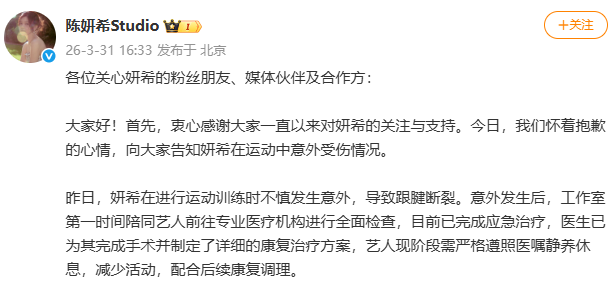 各位关心妍希的粉丝朋友、媒体伙伴及合作方:大家好!首先,衷心感谢大家一直以来对妍希的关注与支持。今日,我们怀着抱歉的心情,向大家告知妍希在运动中意外受伤情况。