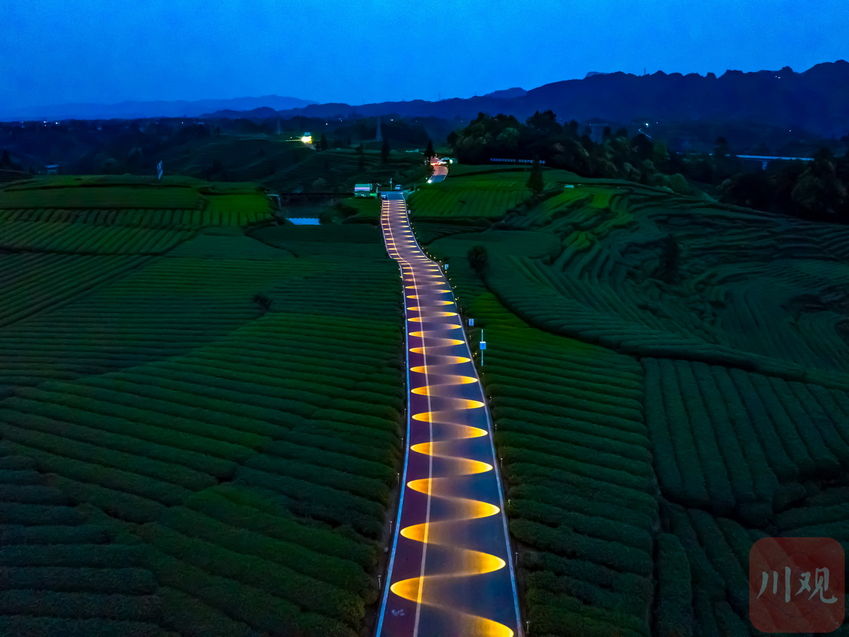 夜晚,雅安名山茶田的太阳能灯亮起,像一条金黄的小龙