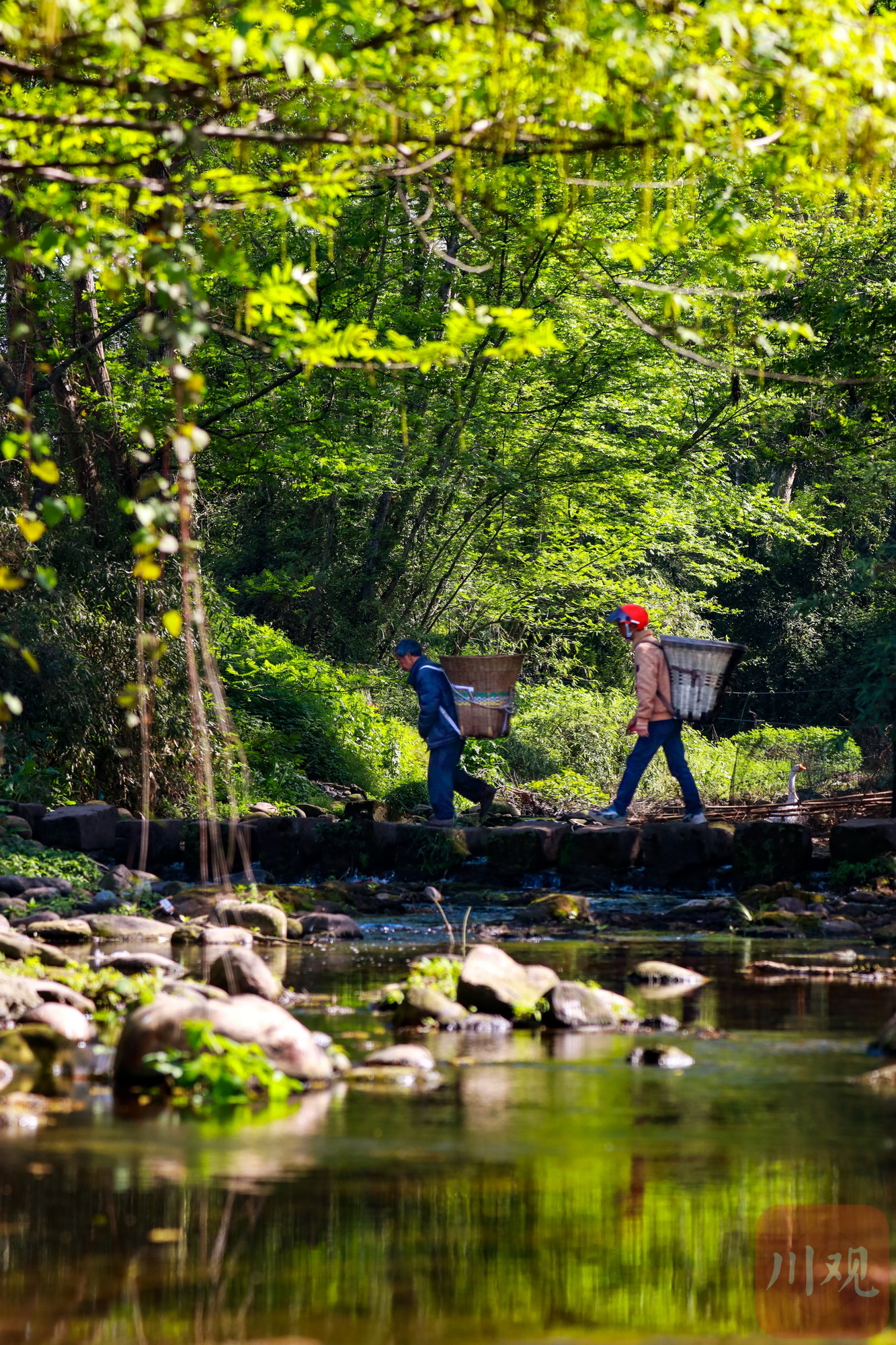 茶农踏过石板桥赶路卖茶