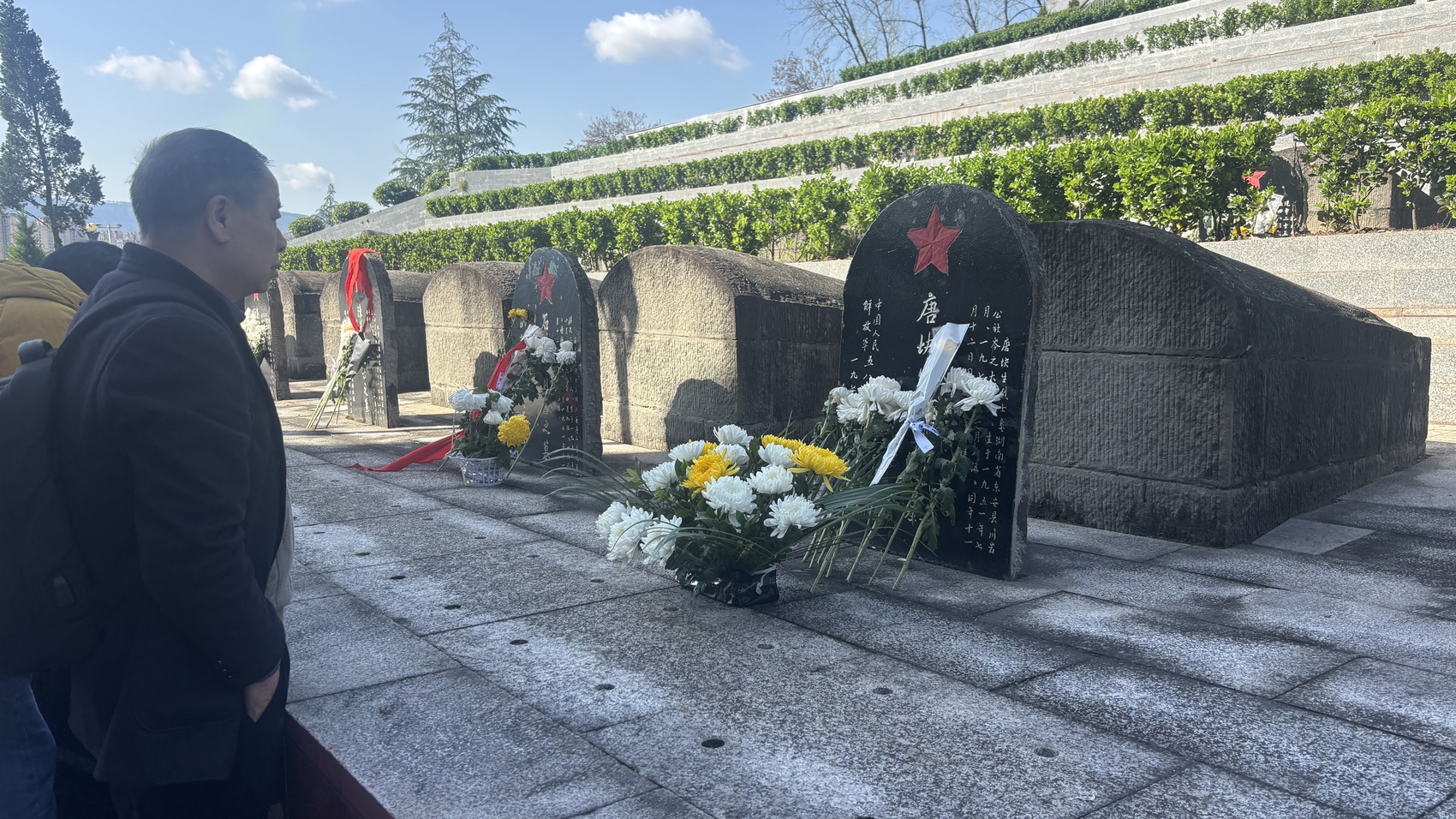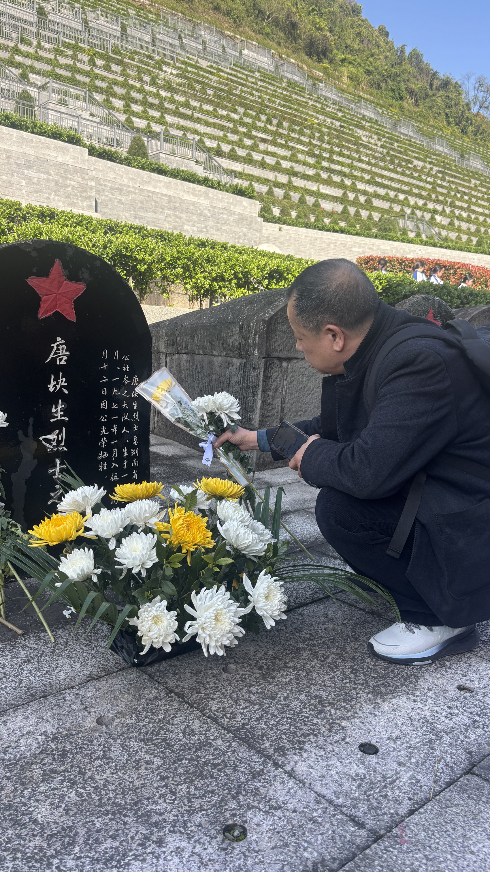 人群中,几位远道而来的祭扫者步履匆匆、神情凝重。在陵园工作人员引领下,他们手捧鲜花,径直来到刻有“唐块生”字样的墓碑前。因年代久远,烈士姓名略有出入,其原名实为唐快生。