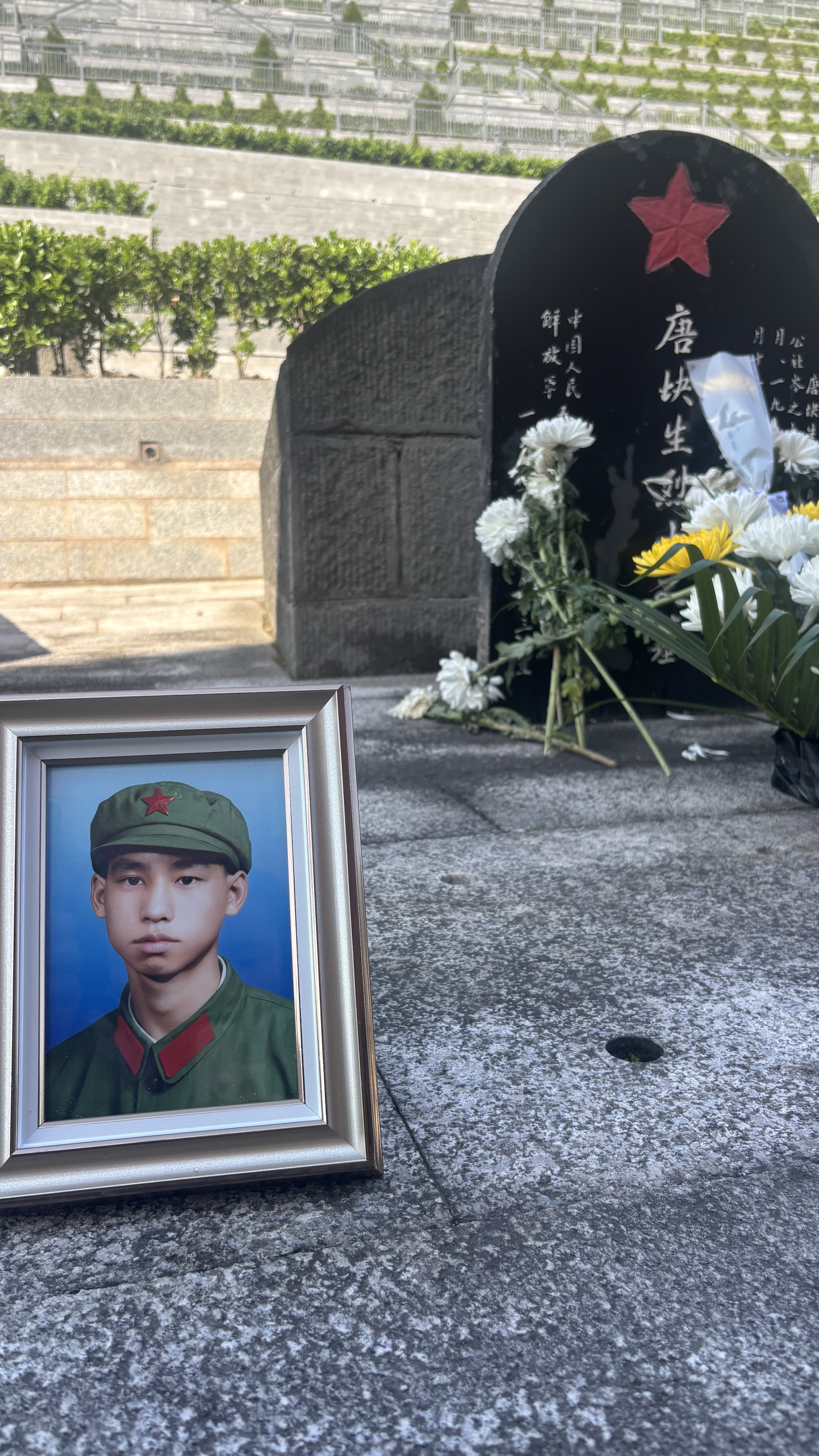 刚到烈士陵园,唐满生便将早已怀抱在怀的鲜花轻轻放在烈士墓前。唐盛取出精心装裱的大伯军装照,郑重摆放在墓碑前。三人静立碑前,深深鞠躬,五十五载的牵挂与思念,尽在这一礼之中。