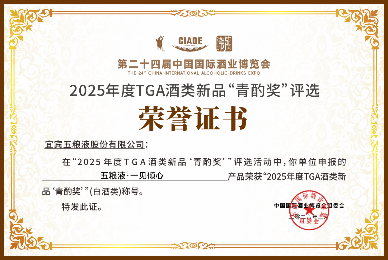 2026年3月,第二十四届中国国际酒业博览会颁奖盛典上,2025年度TGA酒类新品“青酌奖”名单揭晓,五粮液·一见倾心从上百款参评白酒新品中脱颖而出,斩获重量级奖项。