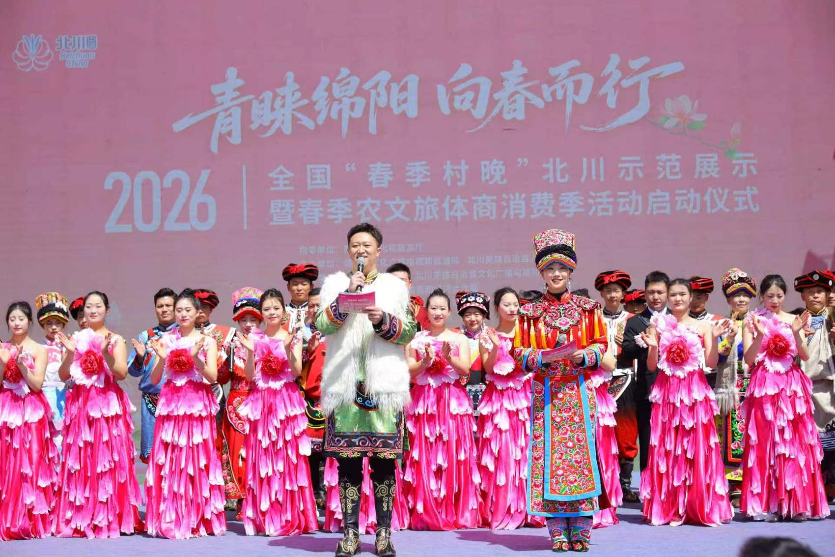 鼓乐震天,羌歌飞扬。3月31日,北川羌族自治县桂溪镇九皇山丰收广场人声鼎沸、喜气融融,身着绚丽羌族服饰的群众载歌载舞,四方游客欢聚一堂,“青睐绵阳·向春而行”2026年全国“春季村晚”北川示范展示暨春季农文旅体商消费季正式开幕。