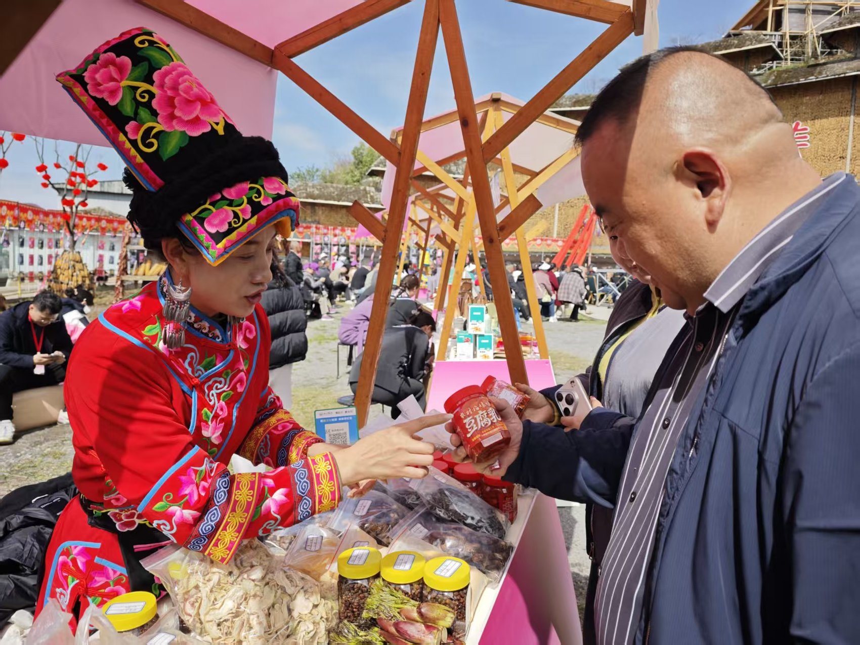 摊主向游客推介特色农产品