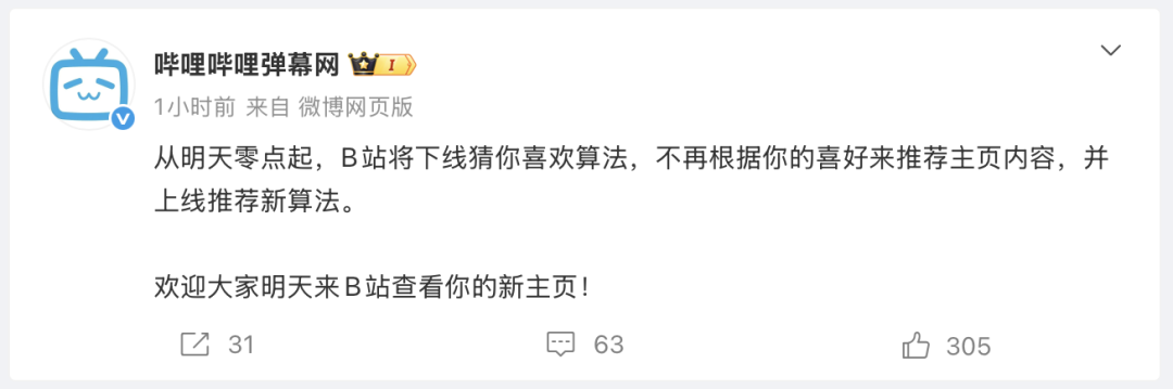 3月31日下午,哔哩哔哩弹幕网(B站)发文表示:从明天(4月1日)零点起,B站将下线猜你喜欢算法,不再根据你的喜好来推荐主页内容,并上线推荐新算法。