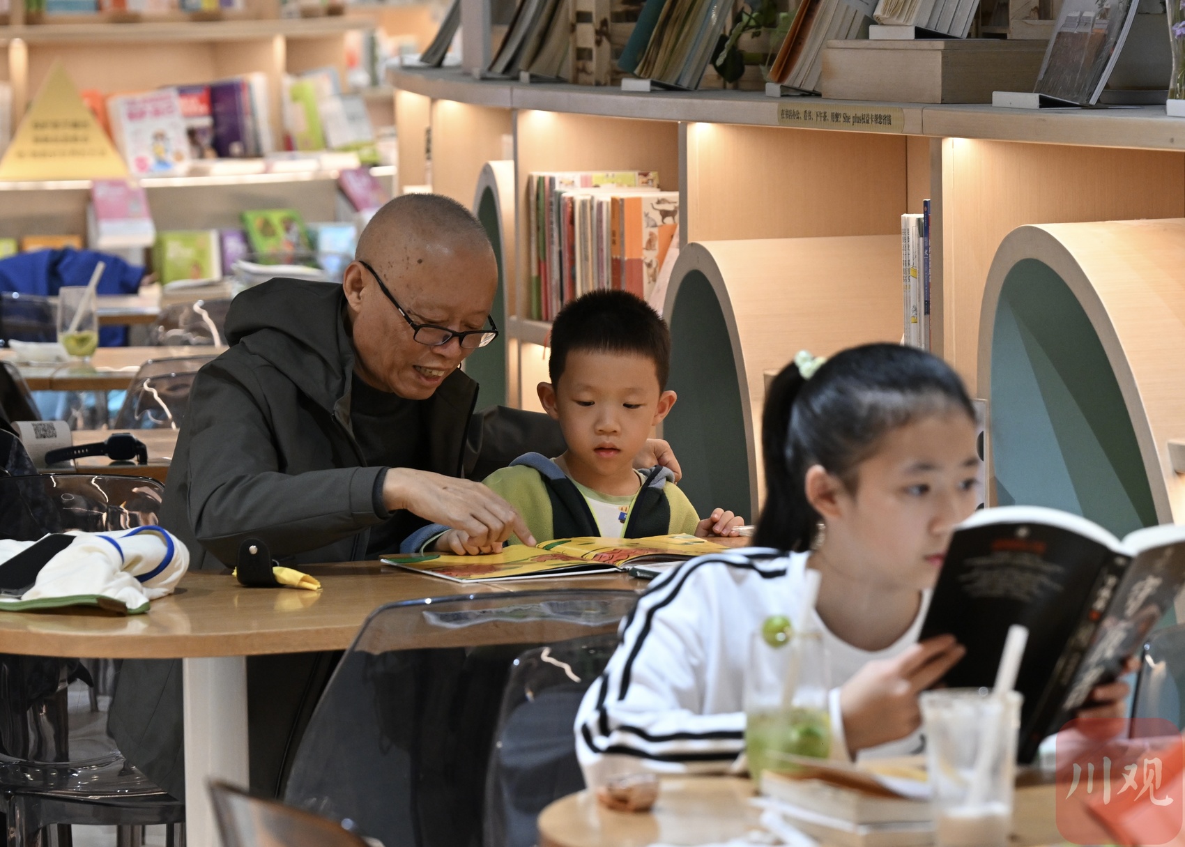 一些低年级学生在家长陪伴下共读,不时低声交流;年龄稍长的学生则独立选书、安静阅读,偶尔提笔记录。