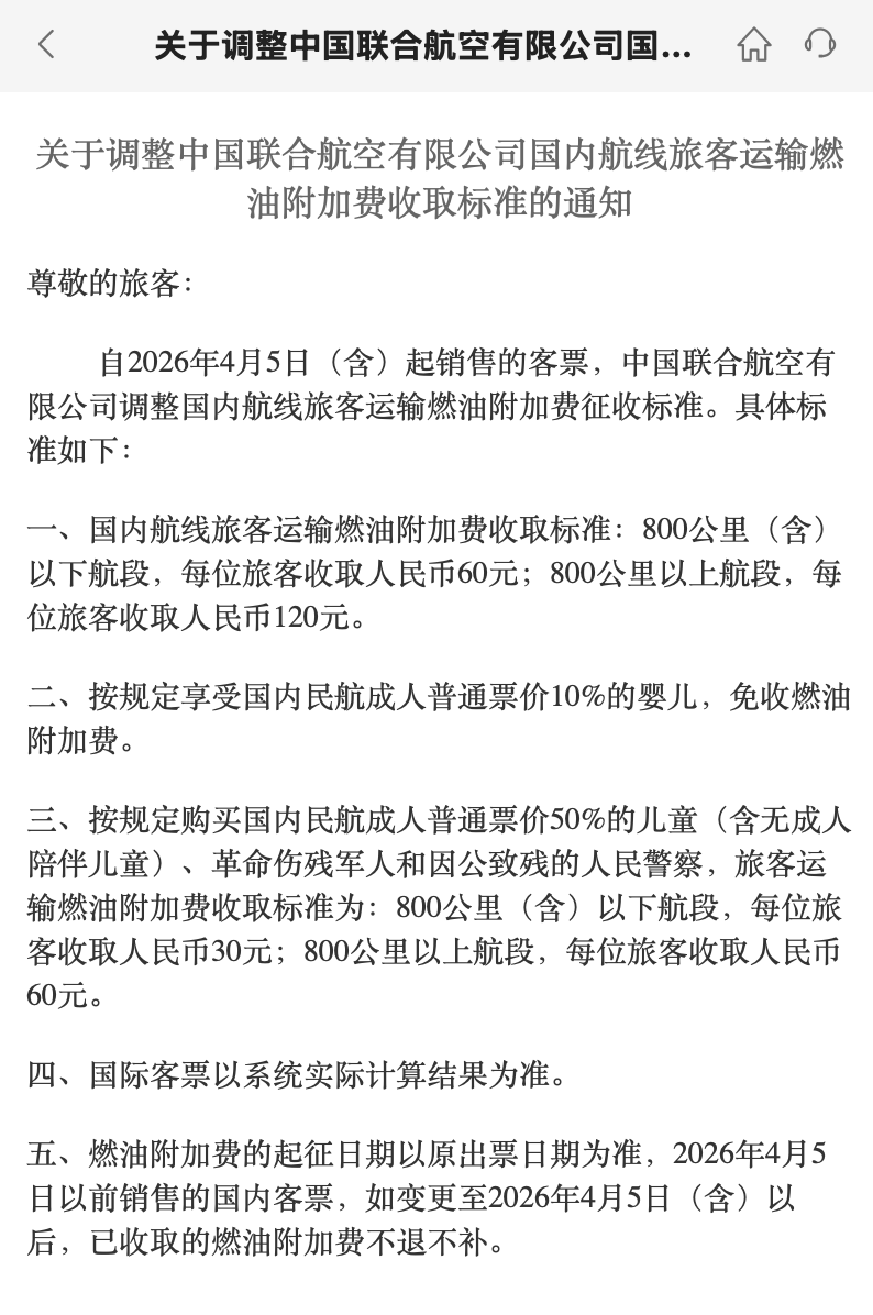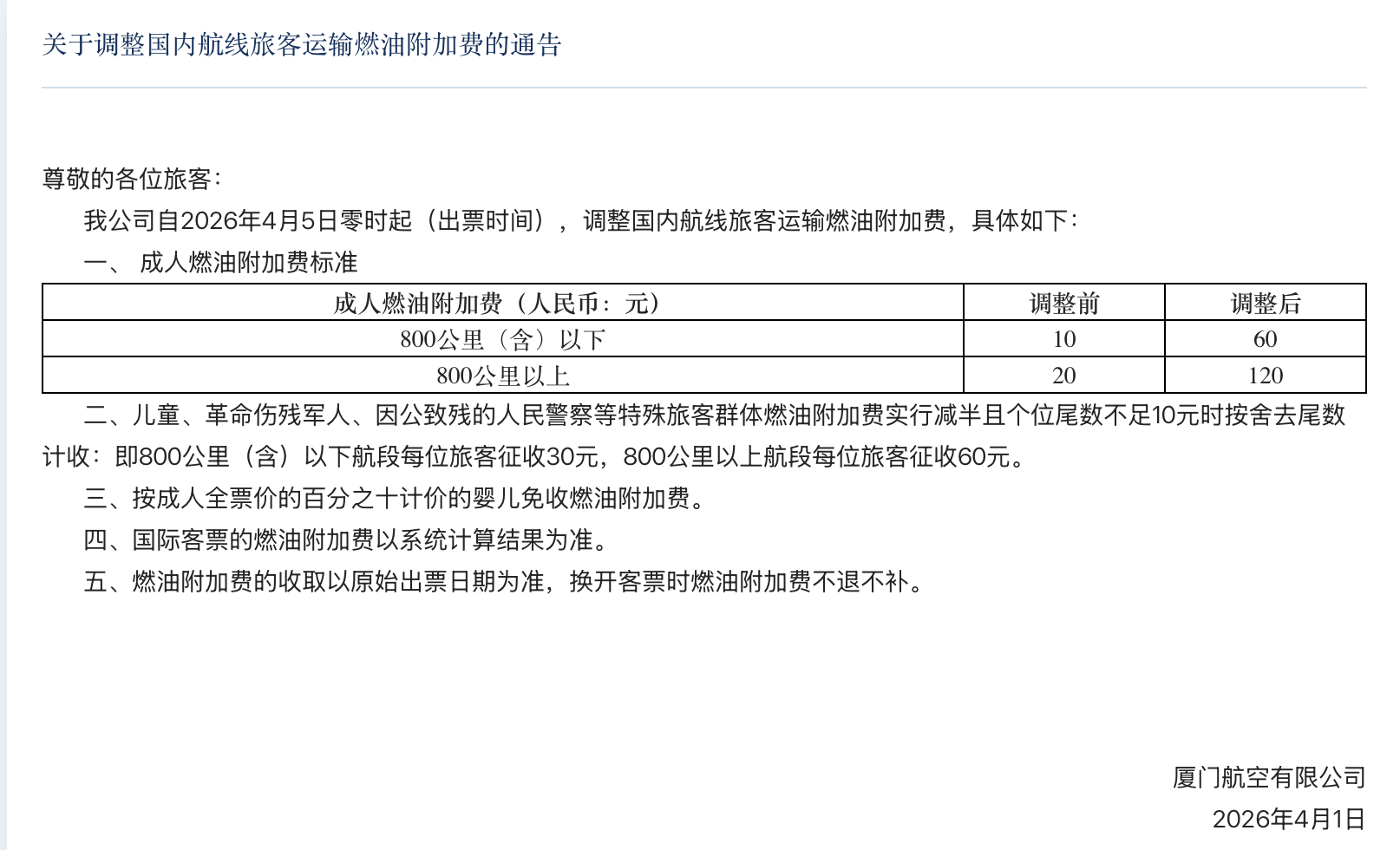 4月1日,厦门航空、中国联合航空在其官网发布公告,自2026年4月5日(含)起销售的客票,将调整国内航线旅客运输燃油附加费的收取标准,调整后较之前上涨5倍。