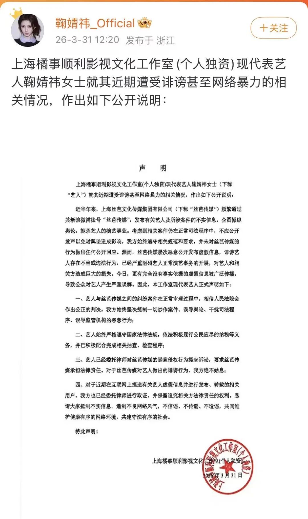 刚刚,鞠婧祎方发布声明: