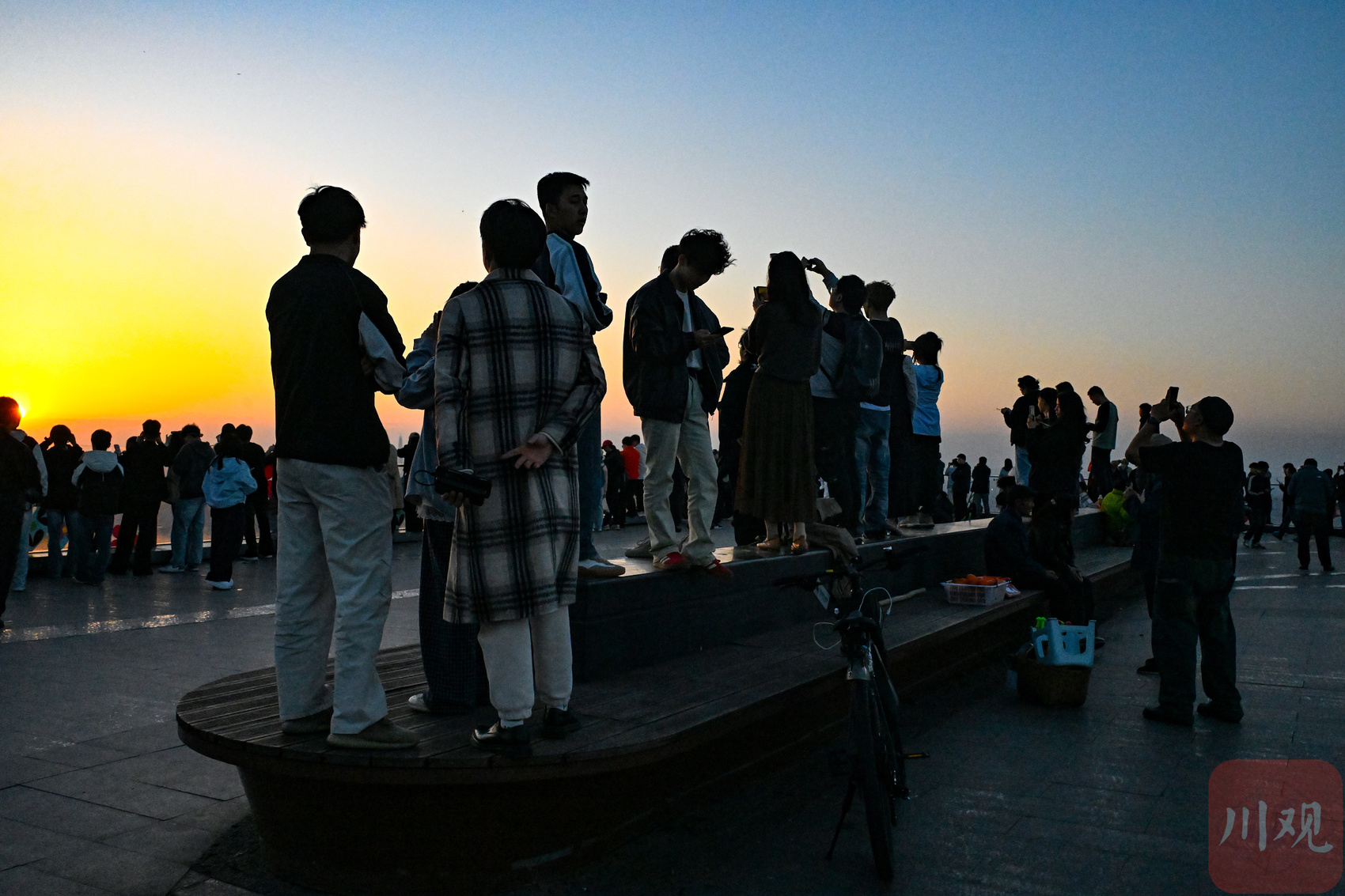 2026年3月31日傍晚,游客和市民在成都龙泉驿区的龙泉山顶观景台看日落景观。