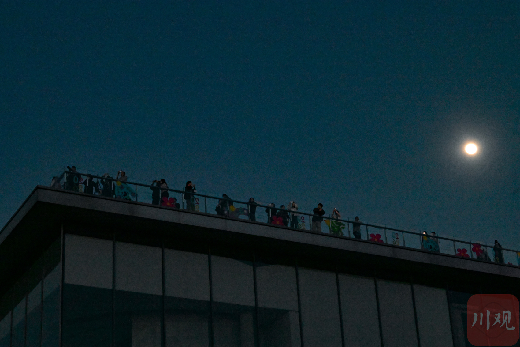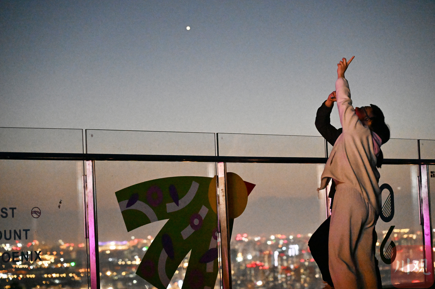 2026年3月31日傍晚,游客和市民在成都龙泉驿区的龙泉山顶一边赏月一边欣赏山顶夜景景观。