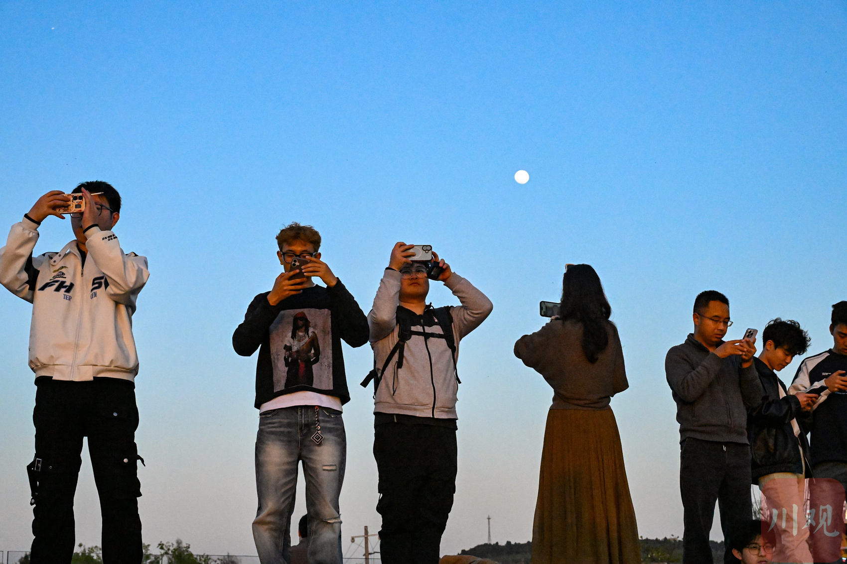 2026年3月31日傍晚,游客和市民在成都龙泉驿区的龙泉山顶一边赏月一边看日落。