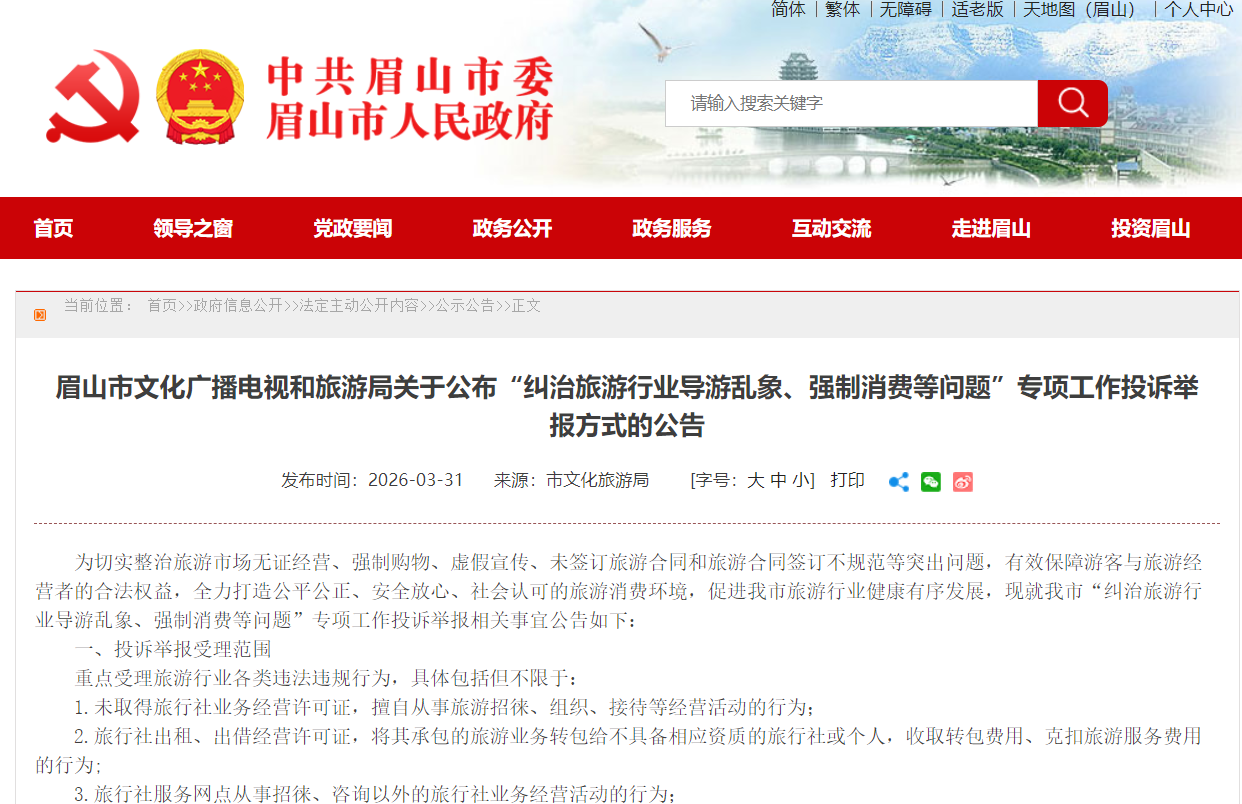 3月31日,眉山市文化广播电视和旅游局公布“纠治旅游行业导游乱象、强制消费等问题”专项工作投诉举报方式,为游客出游保驾护航。