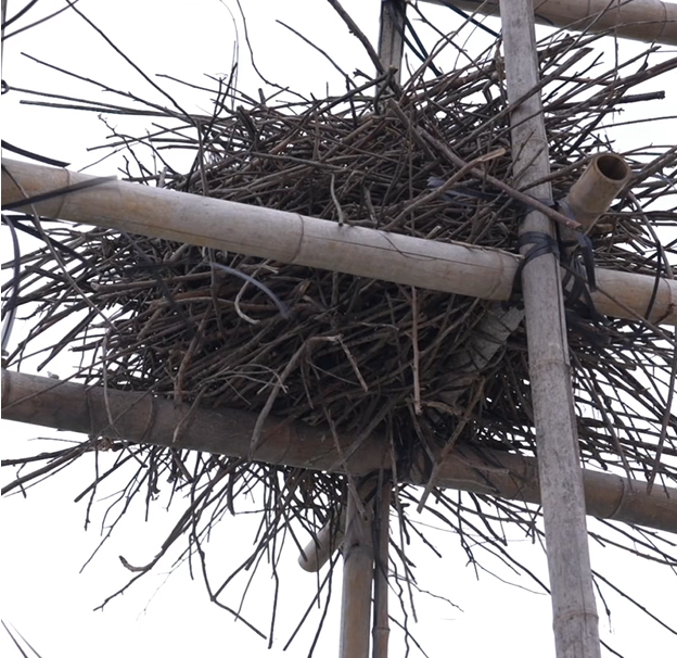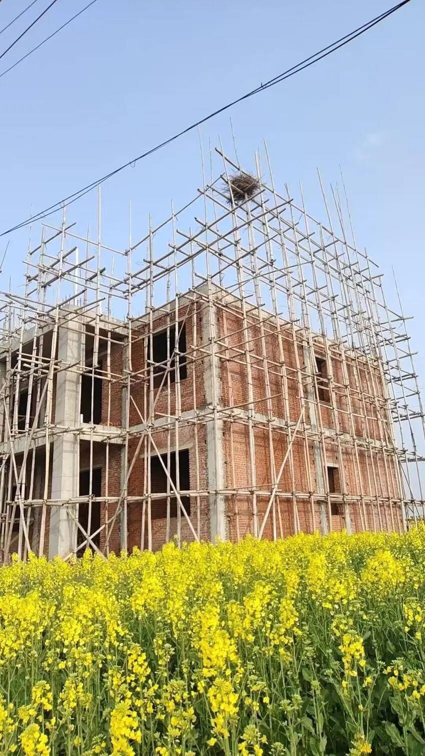 在脚手架缝隙间衔来枯枝与细藤