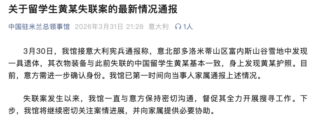 中国驻米兰总领事馆3月31日发布关于留学生黄某失联案的最新情况通报:
