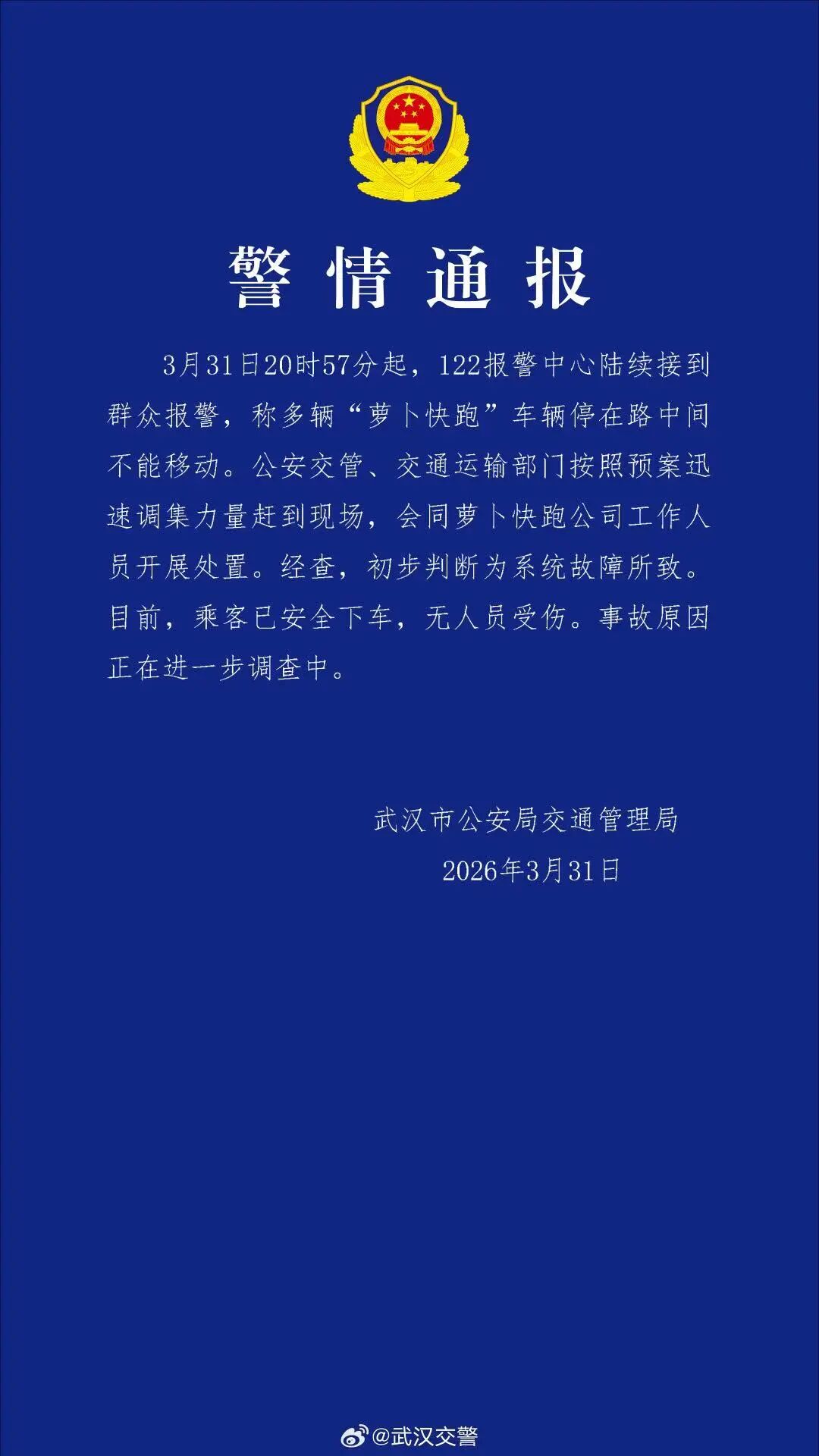 3月31日20时57分起,122报警中心陆续接到群众报警,称多辆“萝卜快跑”车辆停在路中间不能移动。公安交管、交通运输部门按照预案迅速调集力量赶到现场,会同萝卜快跑公司工作人员开展处置。经查,初步判断为系统故障所致。目前,乘客已安全下车,无人员受伤。事故原因正在进一步调查中。