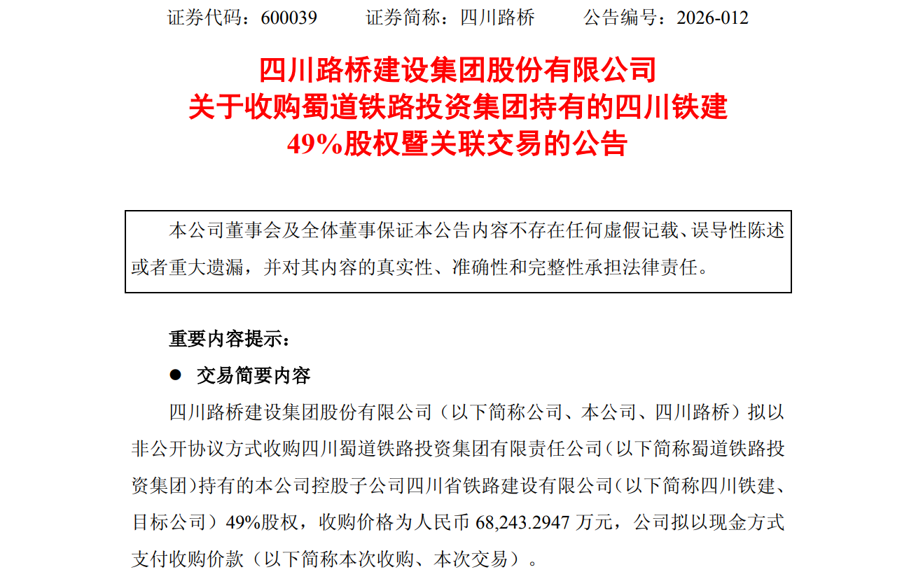 3月31日晚间,四川路桥建设集团股份有限公司(证券简称“四川路桥”)公告,公司拟以非公开协议方式,斥资6.82亿元现金收购四川蜀道铁路投资集团有限责任公司(下称“蜀道铁路投资集团”)持有的四川省铁路建设有限公司(下称“四川铁建”)49%股权。蜀道铁路投资集团为四川路桥控股股东蜀道投资集团有限责任公司(下称“蜀道集团”)的全资子公司,本次收购构成关联交易。