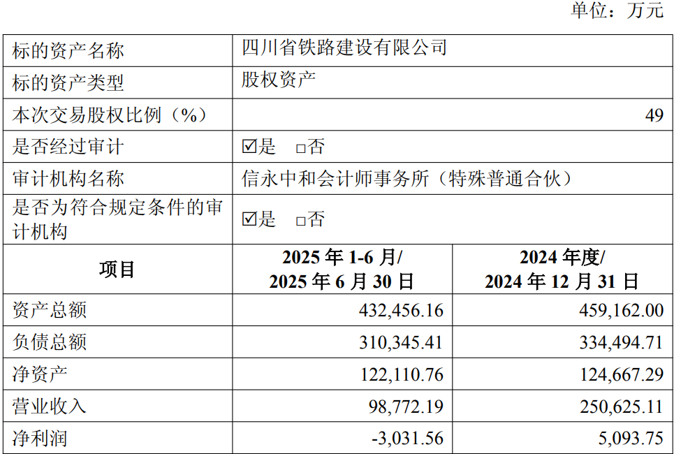 业绩方面,2024年及2025年上半年,四川铁建实现营业收入25.06亿元和9.88亿元,实现净利润5093.75万元和-3031.56万元。截至2025年6月30日,四川铁建资产总额为43.25亿元,净资产为12.21亿元。