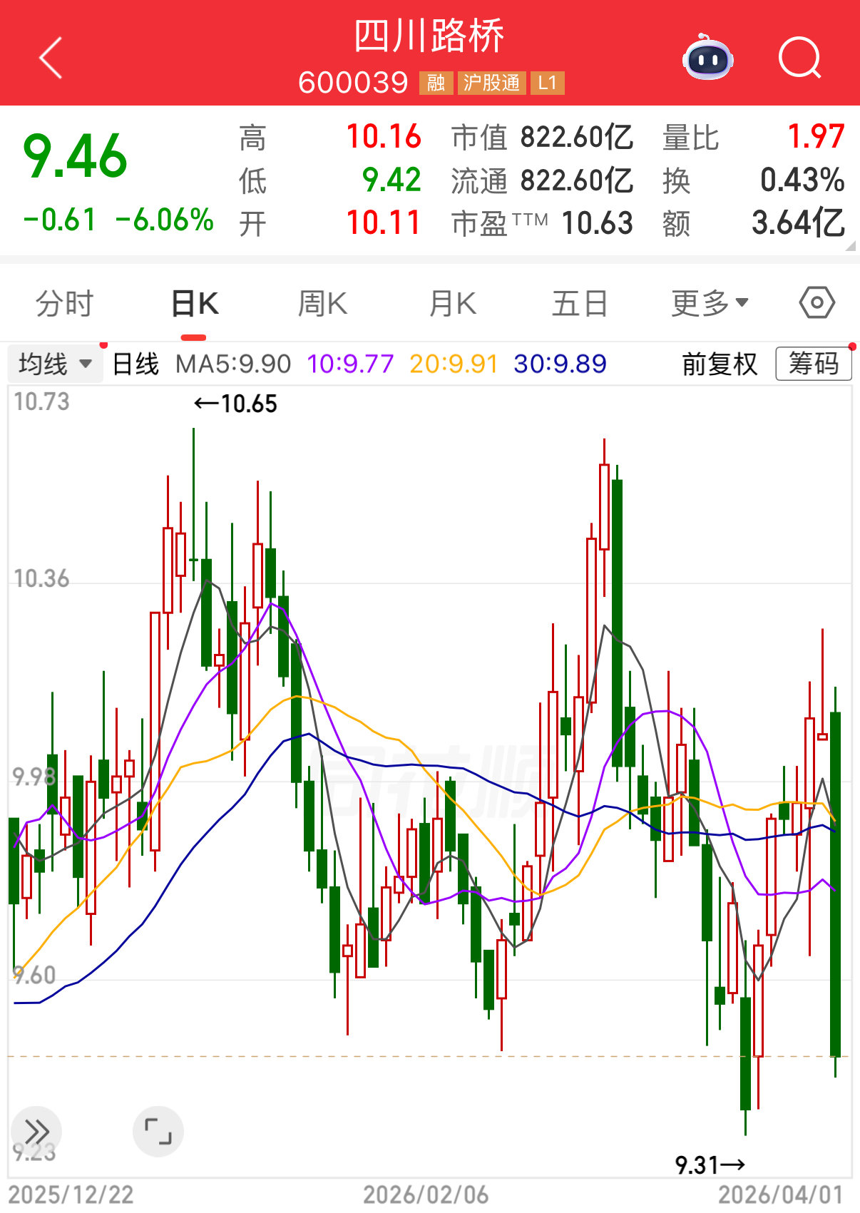 二级市场方面,截至4月1日收盘,四川路桥下跌6.06%,报9.46元/股,总市值822.60亿元。