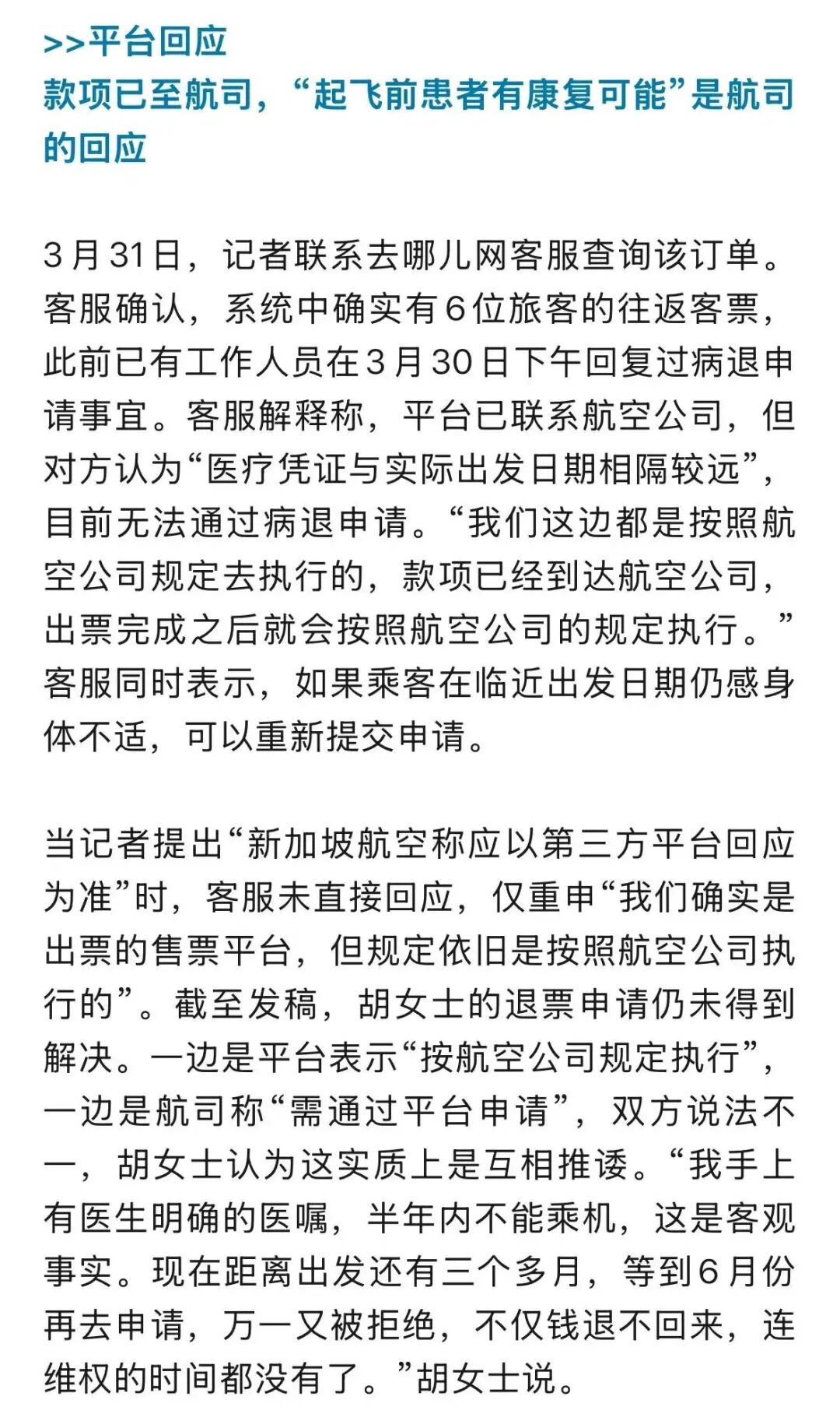 胡女士随后接到平台电话回复,称新加坡航空公司不同意退票。