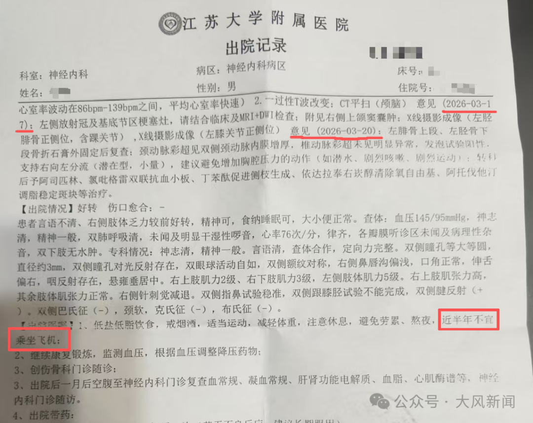 今年3月10日,订单中的一名38岁同行男子突发脑梗入院,在江苏大学附属医院治疗至3月23日出院。医院出具的出院记录显示,该男子出院诊断为:大脑动脉闭塞脑梗死、左侧大脑中动脉闭塞和狭窄、高血压病3级、左胫骨骨折、左腓骨骨折。出院医嘱中特别注明:“近半年内不宜乘坐飞机”。