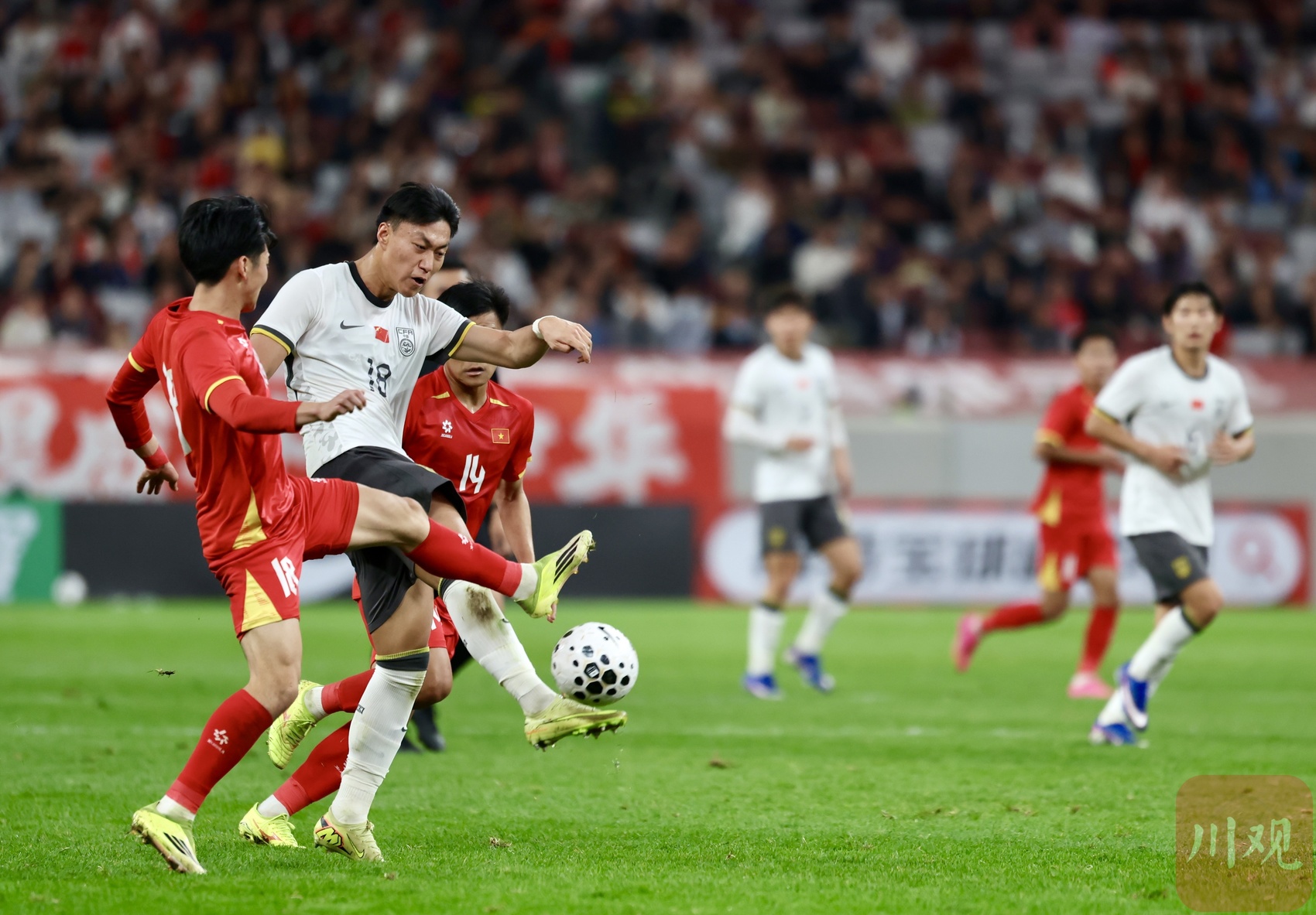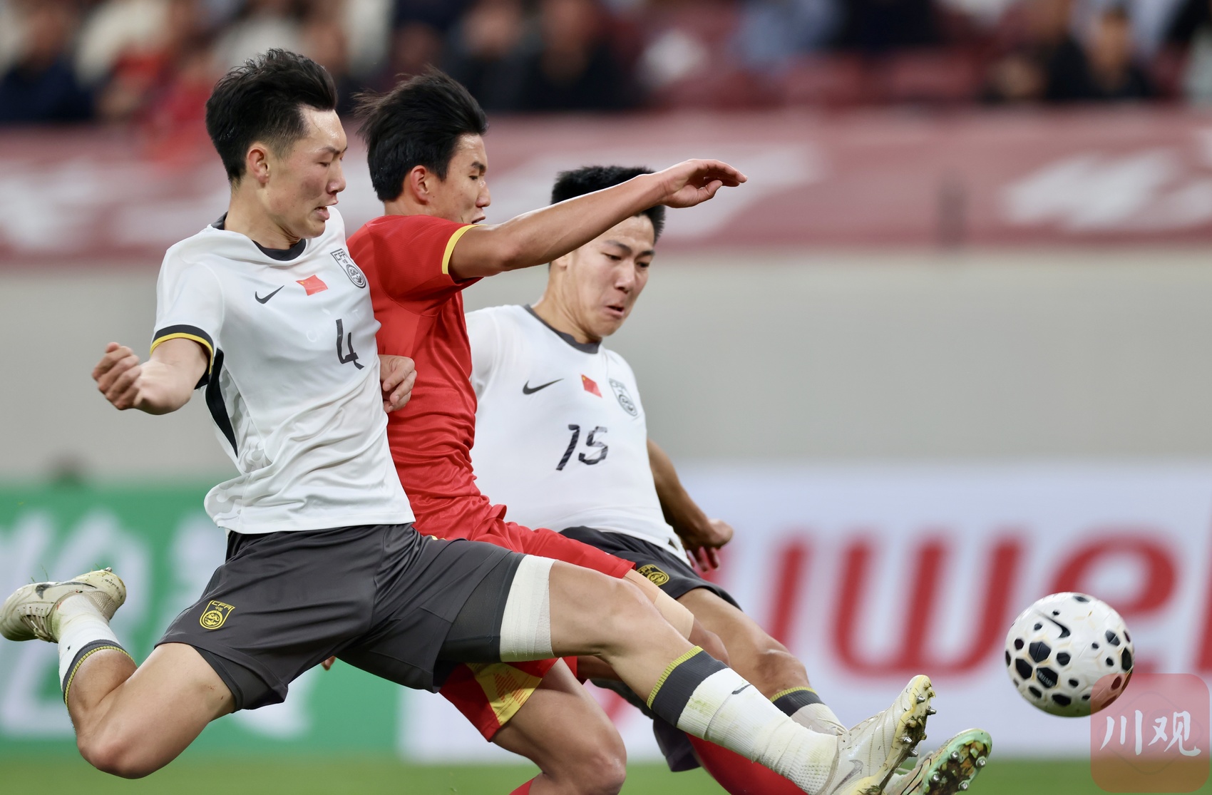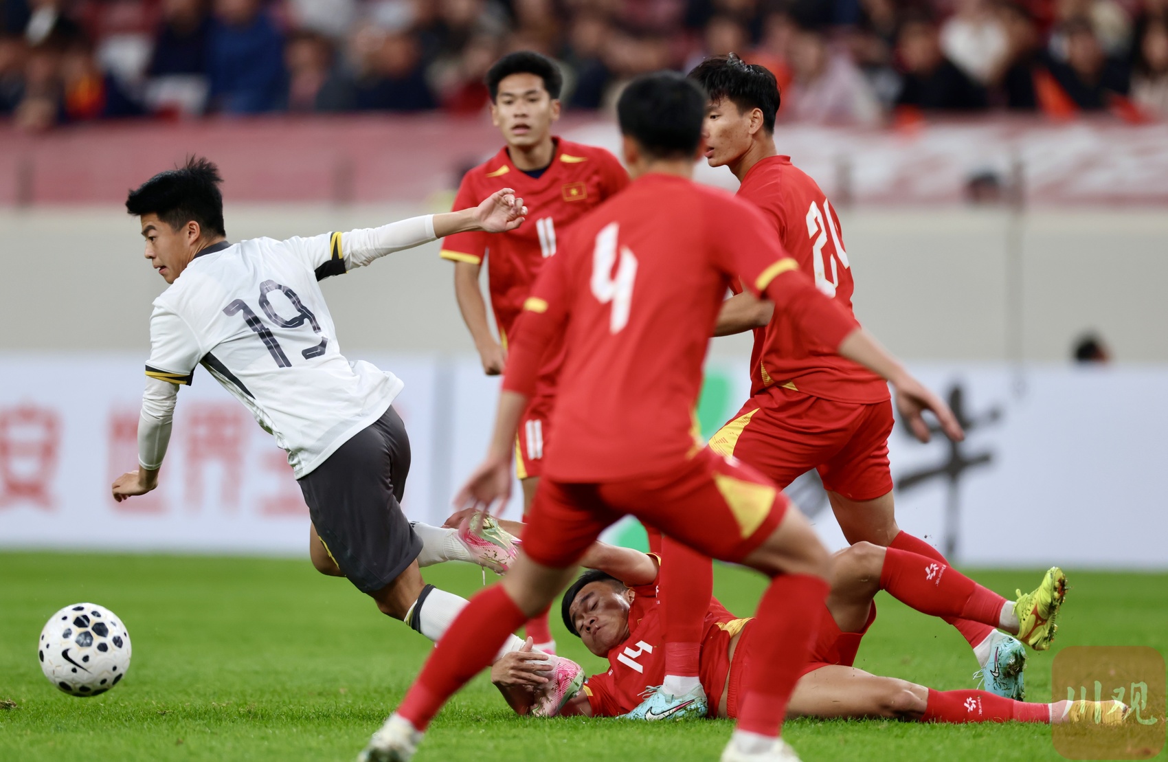 中国U23男足封堵越南队的突破。