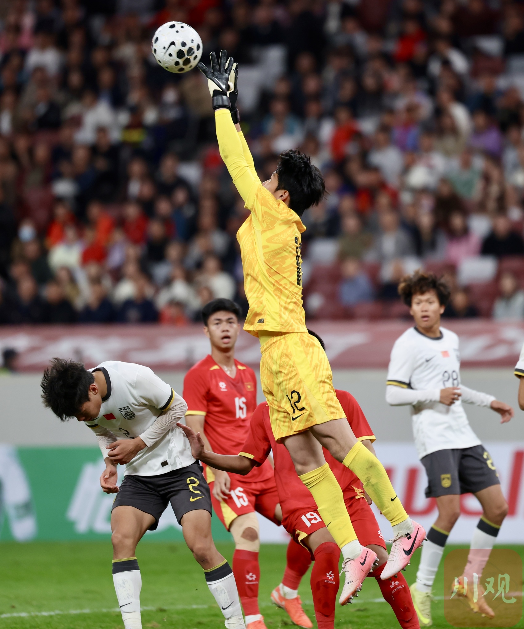 中国U23男足守门员扑救高空球。