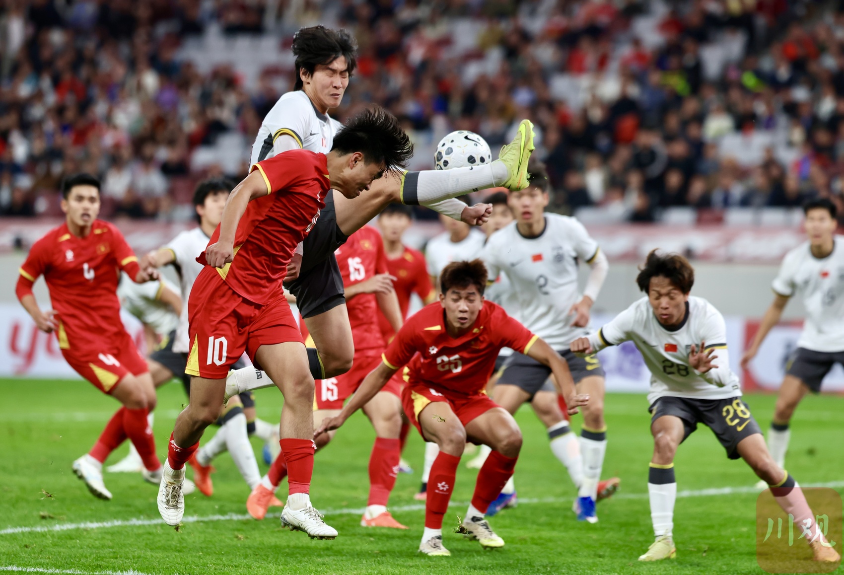 中国U23男足和越南U23男足在禁区争抢头球。