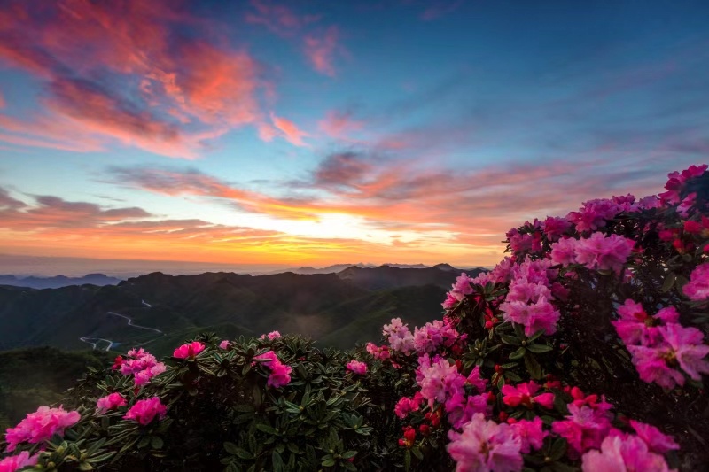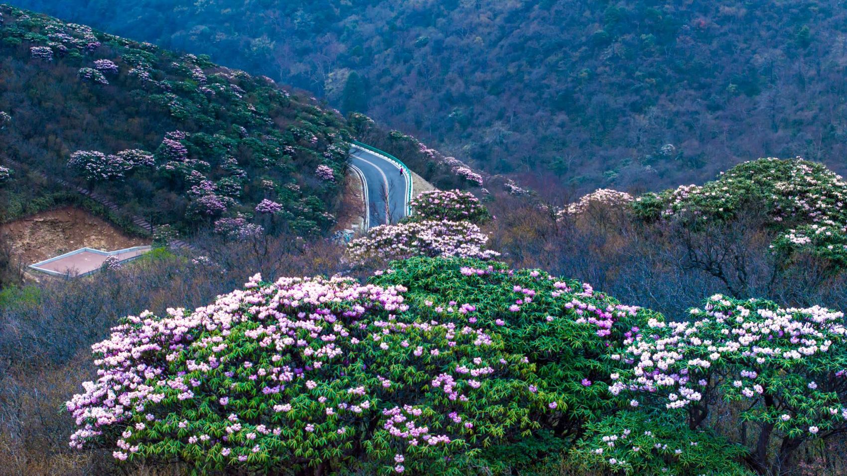春日的光雾山,迎来除漫山红叶外的又一绚烂时刻——被称为“园中贵族,花中西施”的高山杜鹃热烈盛开。国道244沿米仓山山脊蜿蜒,从山谷到香炉山巅,万亩杜鹃次第绽放,红粉白紫缀满山峦,与古道、云海、森林、蜀门秦关相映成画。盘山公路蜿蜒起伏,一路皆是移步换景的花海画卷,一路尽显春日山峦的温柔壮阔。