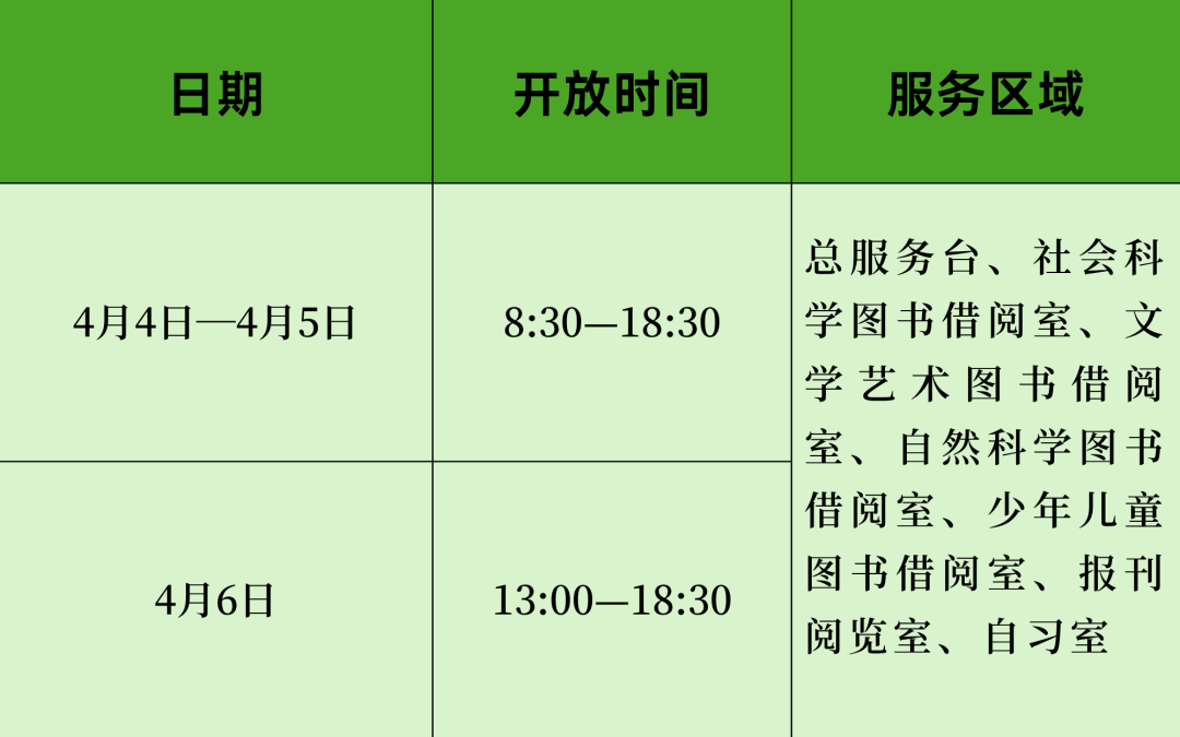 2026年清明节期间,本馆开放时间及服务区域调整如下: