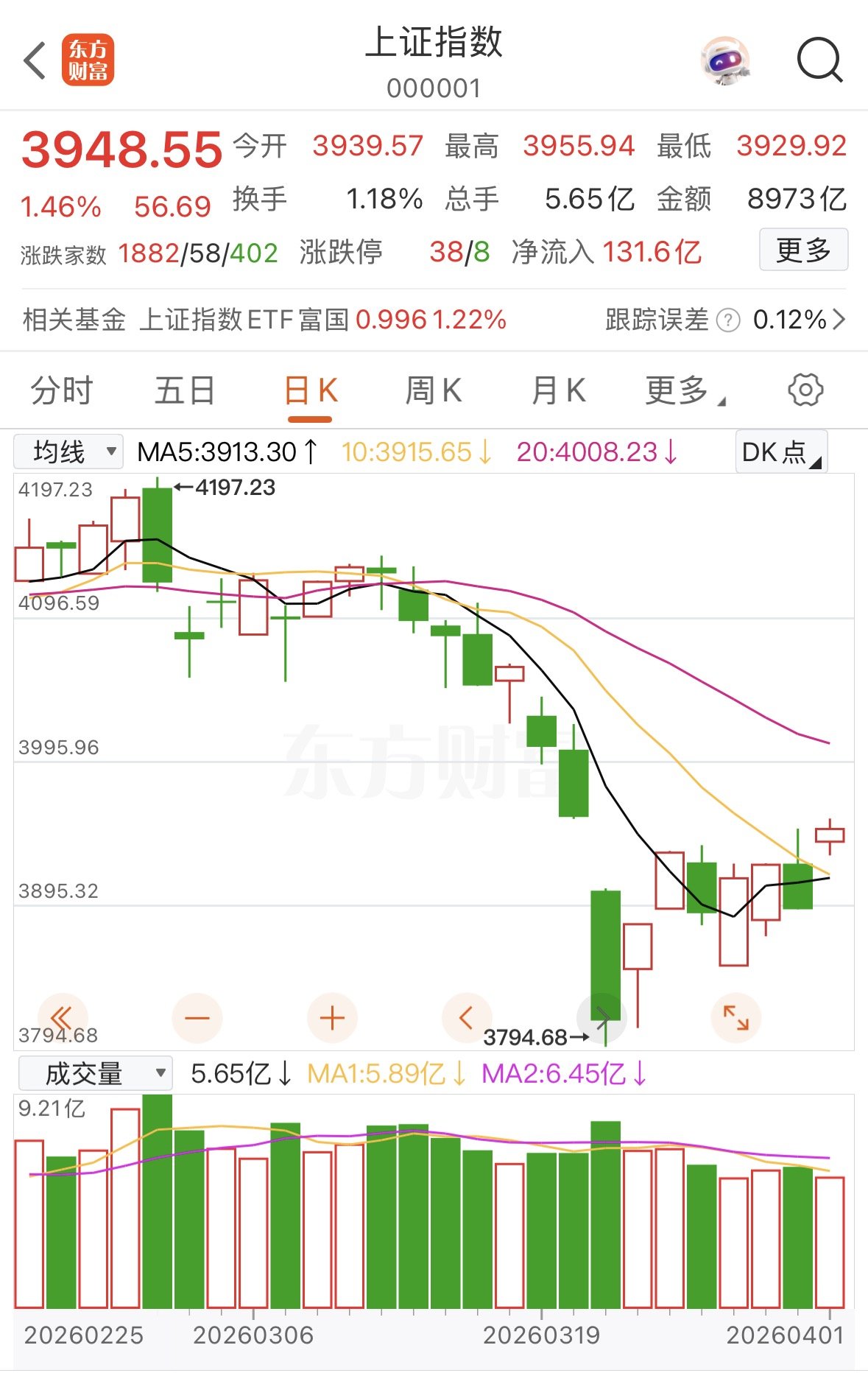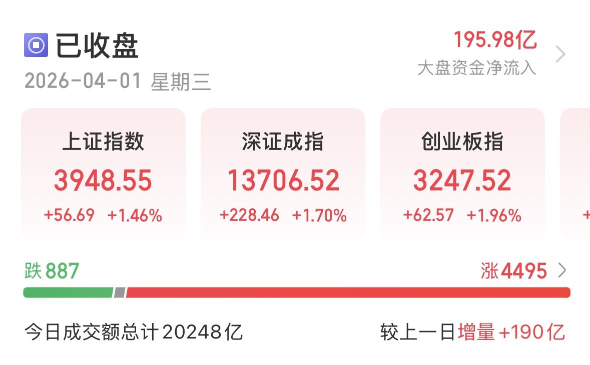 4月1日,二季度首个交易日喜迎“开门红”。截至收盘,沪指涨1.46%,收报3948.55点;深证成指涨1.70%,收报13706.52点;创业板指涨1.96%,收报3247.52点。全市场成交额达到20248亿元,较昨日小幅放量190亿元。股民也纷纷获利,全市场近4500只个股上涨,887只个股下跌。