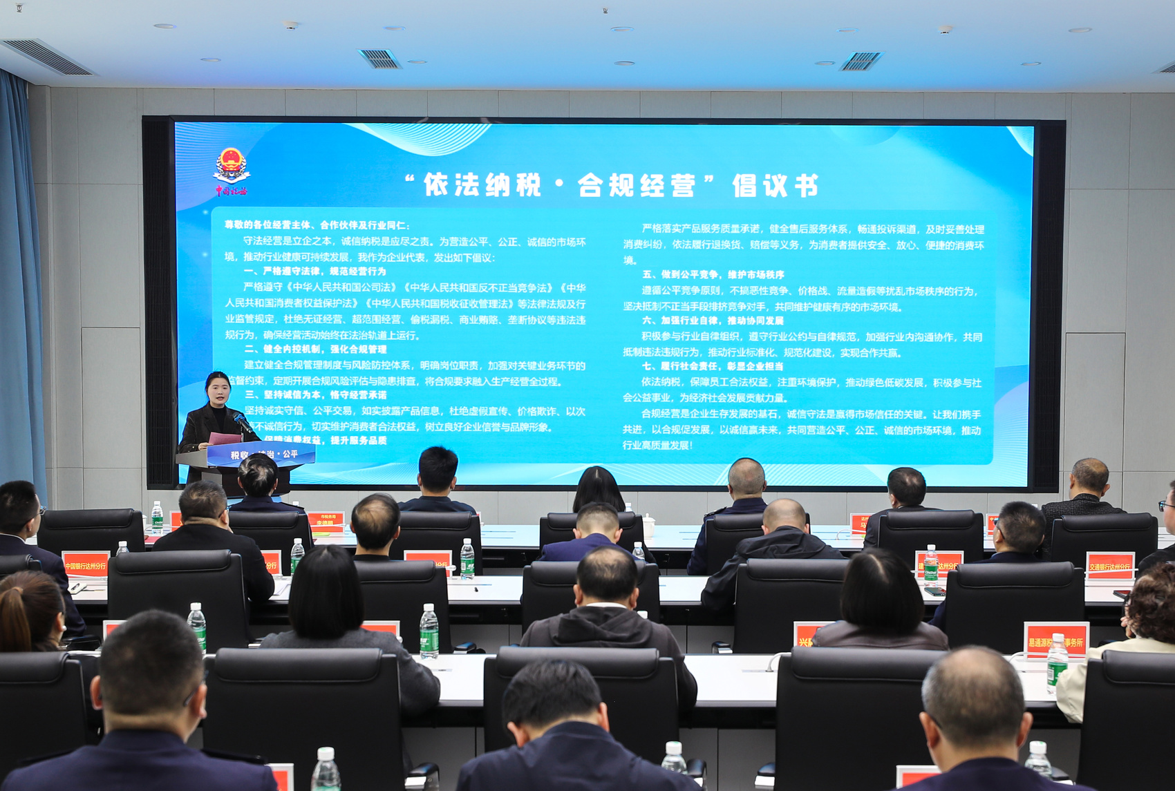 互动交流环节参会代表围绕企业合规经营、税费政策落实、便捷办税服务等痛点难点,提诉求、谈建议。税务干部现场“一对一”答疑、“点对点”解读,精准回应关切,切实打通税企沟通“最后一公里”。随后,企业参会代表上台宣读《依法纳税·合规经营倡议书》,号召广大经营主体坚守法治底线、践行诚信纳税,共筑公平有序的市场环境。