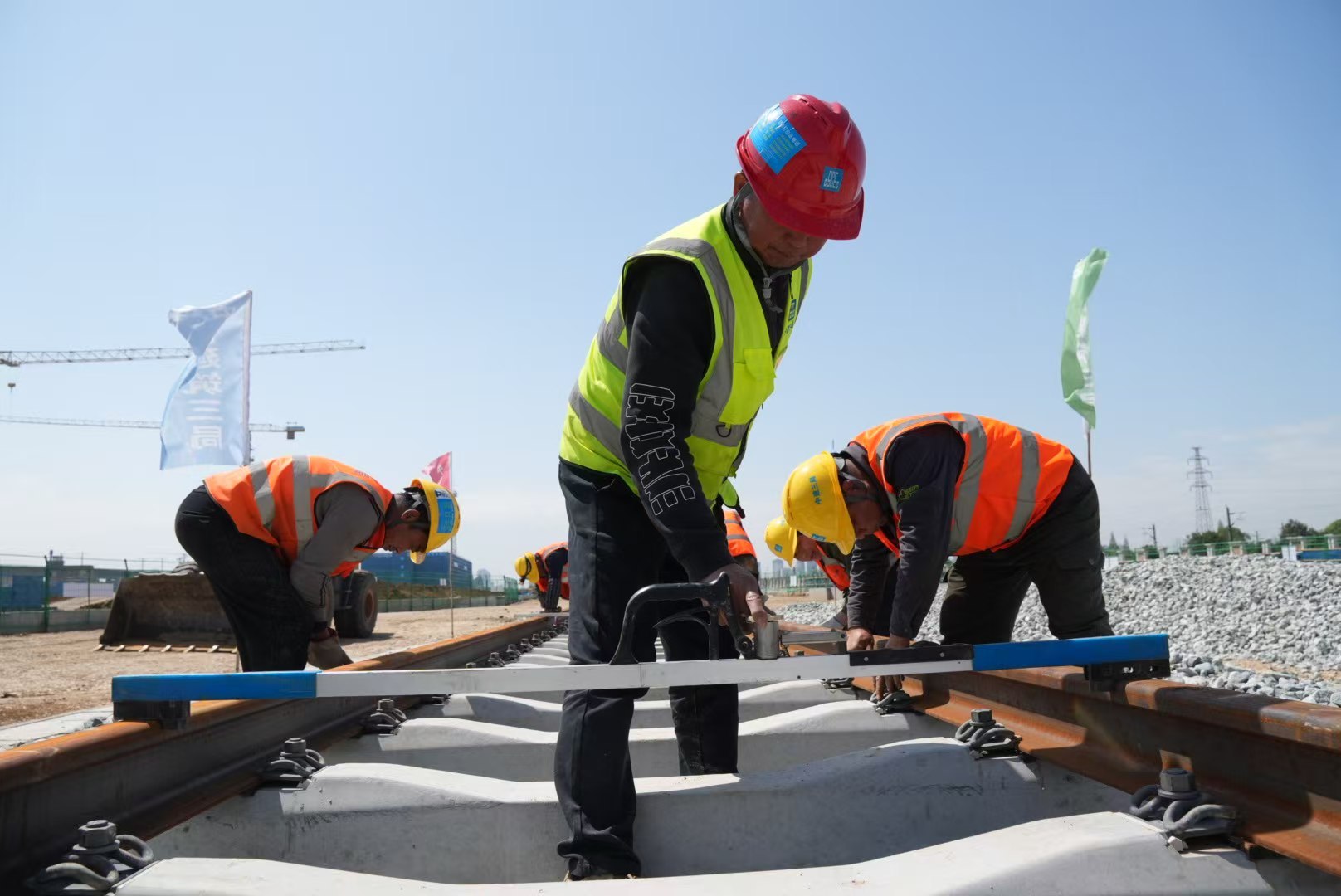 成德线北端德阳北车辆段铺轨基地,工人正在铺设轨排。