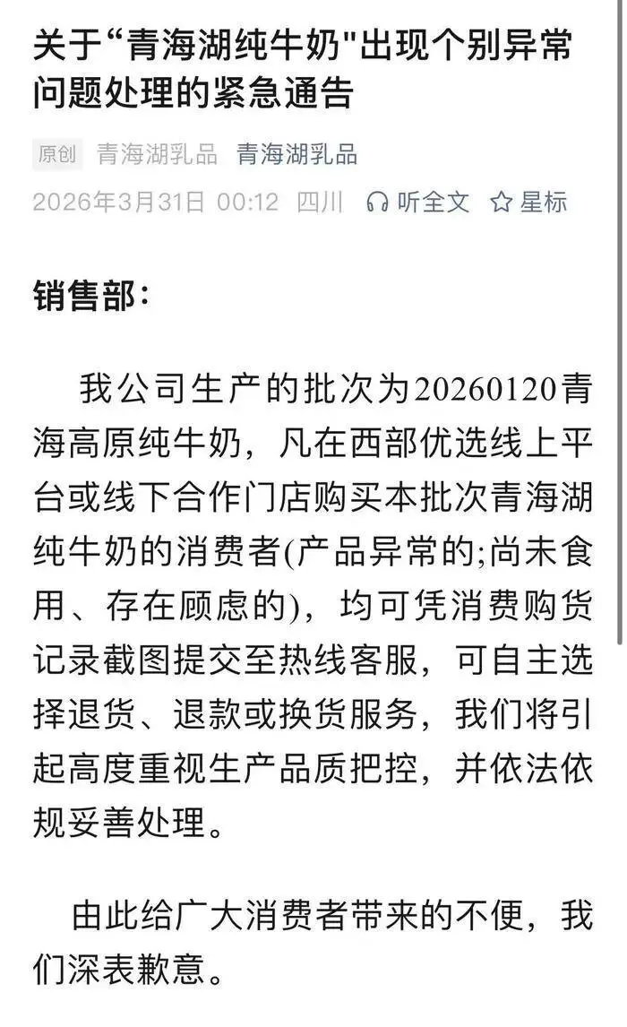 2026年3月30日,针对媒体反映“青海雪峰牦牛乳业有限责任公司生产的高原纯牛奶产品包装内出现透明液体”的问题,共和县市场监督管理局高度重视,第一时间成立调查组,进驻生产企业开展全面调查,同步启动同批次产品召回封存工作,对企业纯牛奶系列备样产品抽样送检,并对全类别产品开展全面排查。