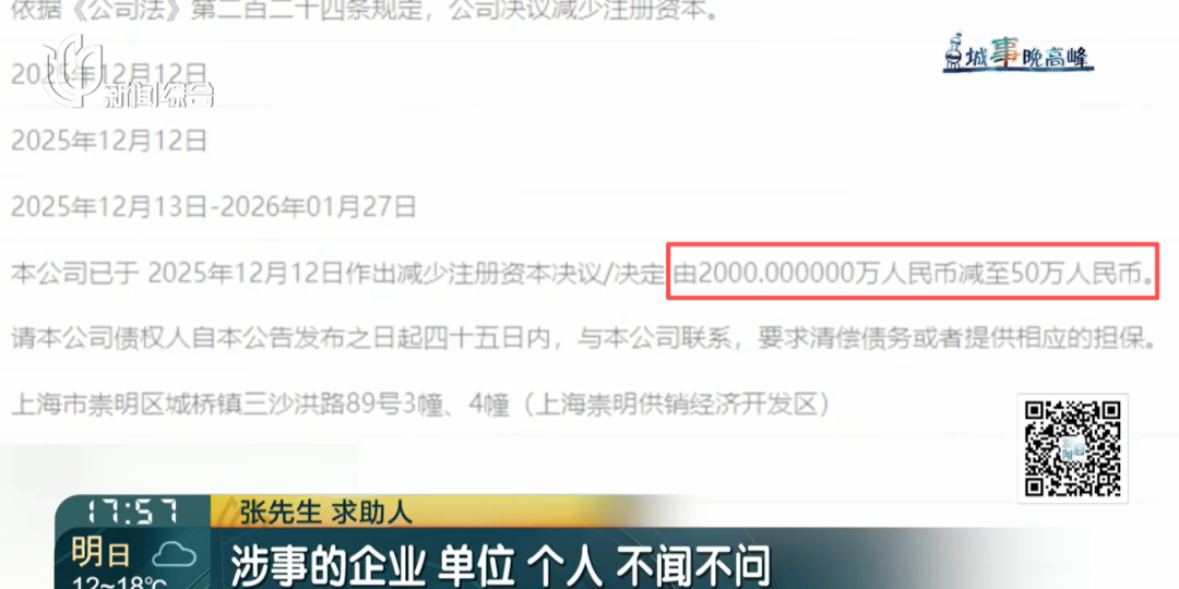 这家物流公司的减资行为是否符合法律规定?对此,上海崇明区市场监管局注册许可科副科长吴雪松表示,公告期是从2025年12月13日到2026年1月27日,就本次申请而言,如果相关债权人在登记部门核准登记前对相关减资提出了异议或者有情况的反映,我们登记部门也将根据实际情况,以及相应的证据材料依法作出相关登记决定。