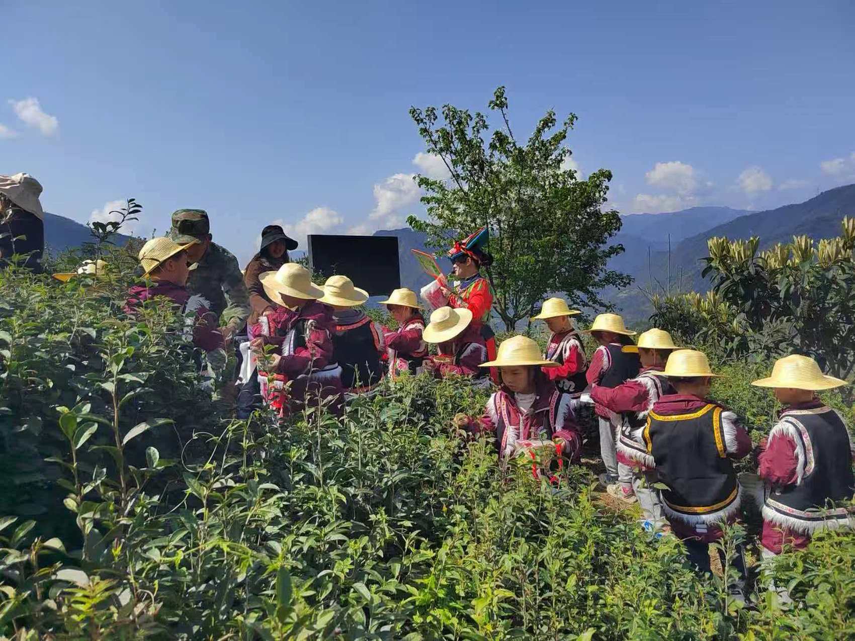 “拇指和食指轻轻捏住嫩芽,往上一提就行了,太老的叶子我们就不要了。”58岁的茶农王大爷半蹲在茶垄间,手把手教孩子们采茶。他所在的25人研学指导团队,由镇里资深茶农、茶技员和村级文旅讲解员组成,从采茶手法到羌茶制作,从本地茶史到制茶口诀,全程跟队指导。