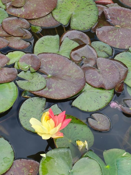 红、黄两种颜色分别占据同一朵睡莲花瓣的两部分,其中黄色面积略微大一些。睡莲在绿色荷叶的映衬下,更加艳丽动人。青宇介绍,从攀枝花学院南门进入后,直行到图书馆前的小水塘,就可以看到这株罕见的双色睡莲了。据她观察,绽放的时间约为上午9时至下午2时。