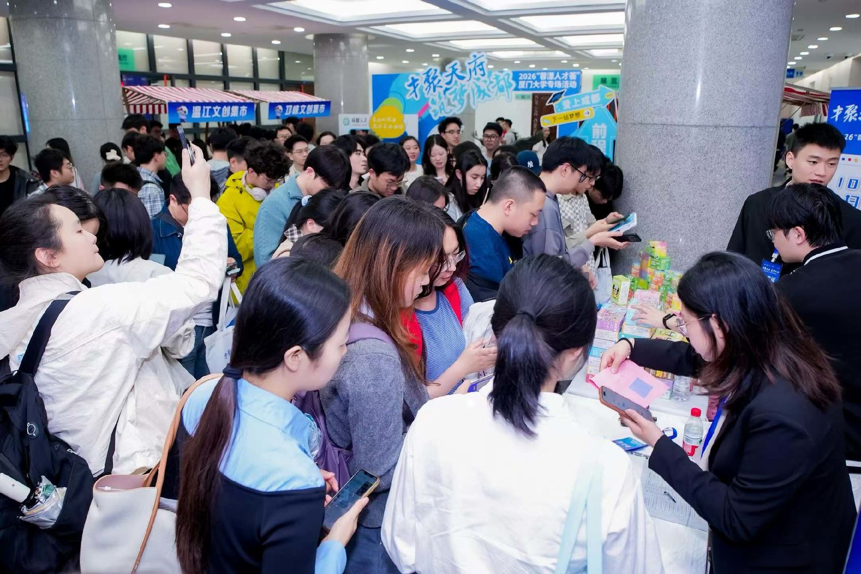 专场招聘会与专场推介会同步开展,双选现场气氛热烈、人头攒动。37家优质企事业单位逐一搭建招聘展位,与厦门大学及周边高校的学子面对面交流洽谈,共绘职业发展蓝图。现场还专门设置政策咨询区与文创展示区,为学子们提供人才落户、安居保障、创新创业等“一站式”全流程服务,贴心解答各类求职疑问。
