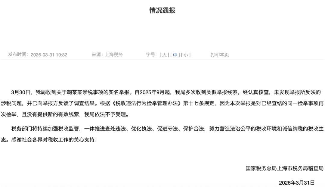 通报称,3月30日,国家税务总局上海市税务局稽查局收到关于鞠某某涉税事项的实名举报。自2025年9月起,该局多次收到类似举报线索,经认真核查,未发现举报所反映的涉税问题,并已向举报方反馈了调查结果。根据《税收违法行为检举管理办法》第十七条规定,因为本次举报是对已经查结的同一检举事项再次检举,且没有提供新的有效线索,该局依法不予受理。