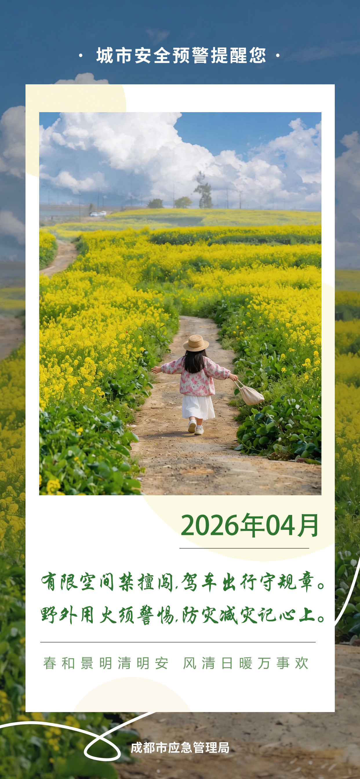4月,气温快速回升,强对流天气多发,春假与清明假期叠加,市民踏青出行、祭祀活动集中,各类风险交织叠加。4月1日,成都市安办(市防减救灾办)提醒生产经营单位和市民重点防范以下安全风险。
