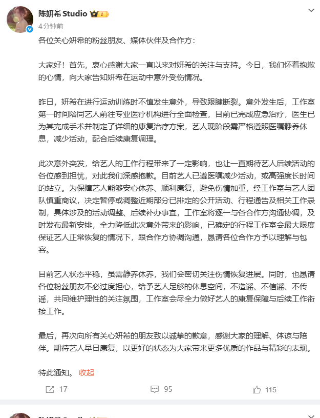 各位关心妍希的粉丝朋友、媒体伙伴及合作方:大家好!首先,衷心感谢大家一直以来对妍希的关注与支持。今日,我们怀着抱歉的心情,向大家告知妍希在运动中意外受伤情况。昨日,妍希在进行运动训练时不慎发生意外,导致跟腱断裂。